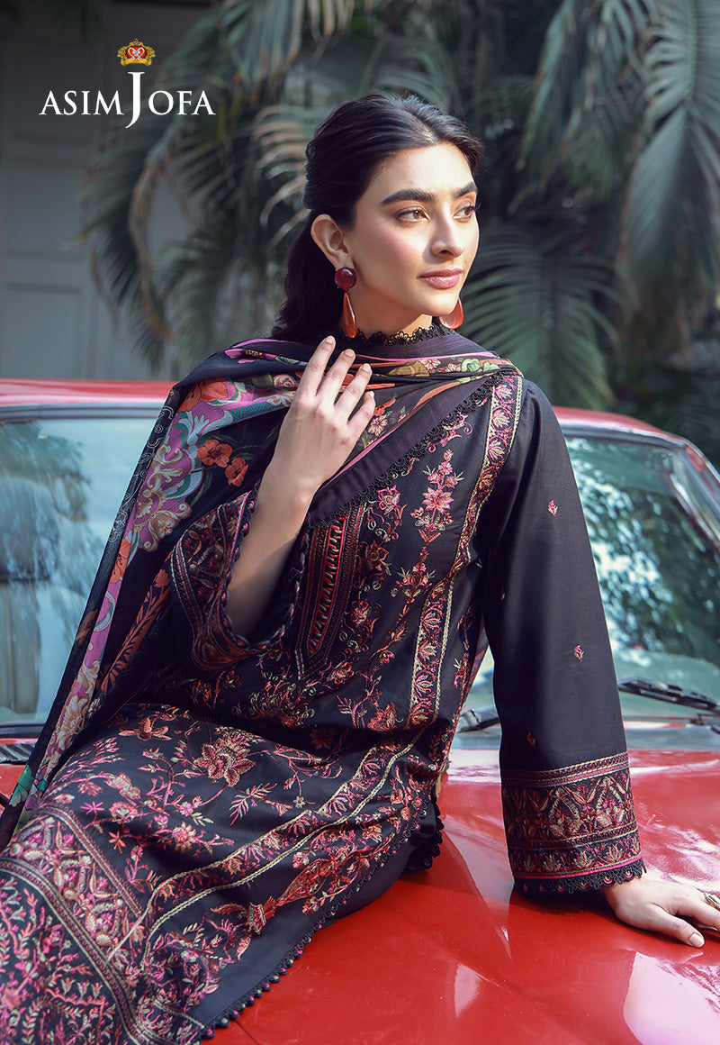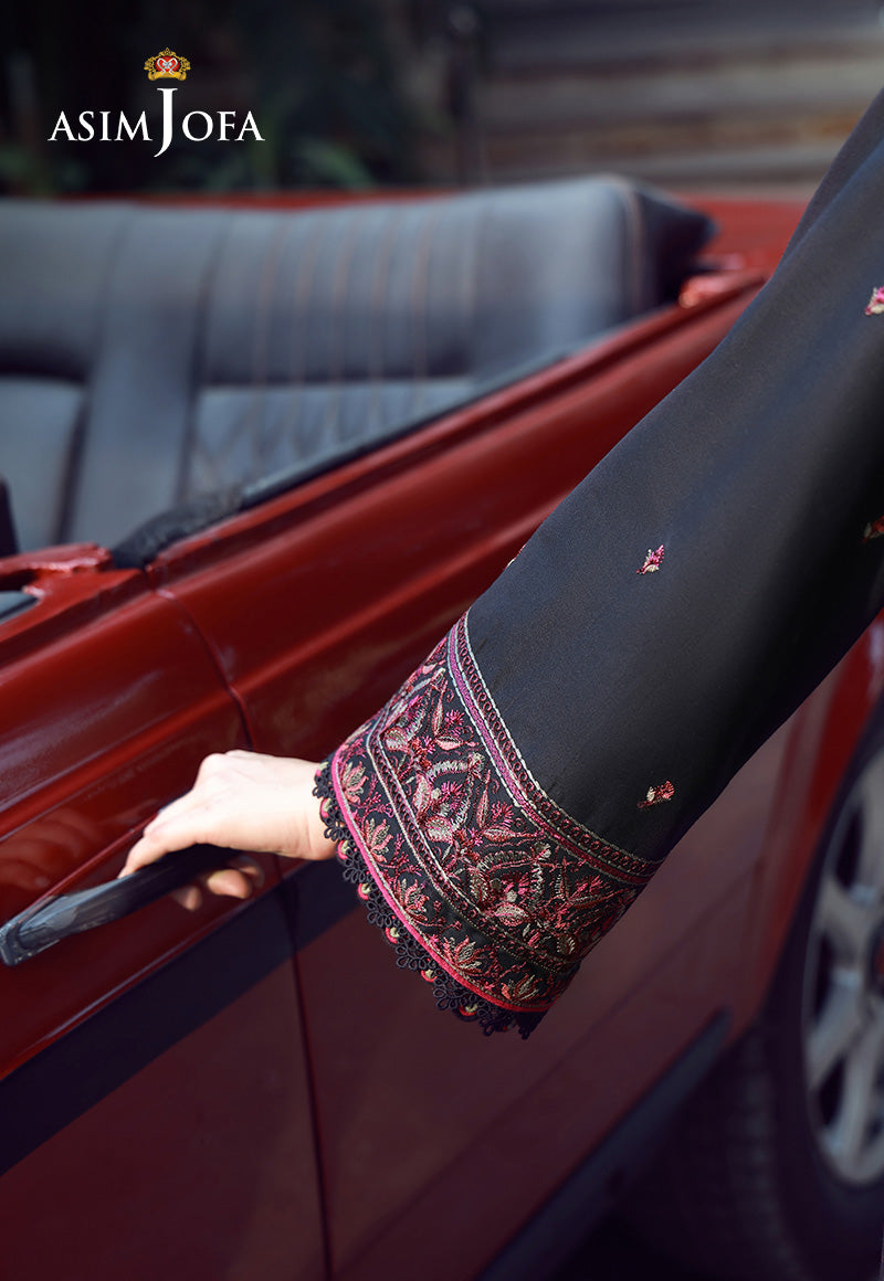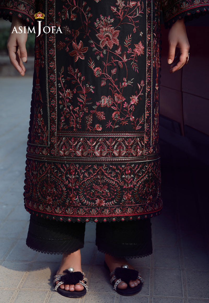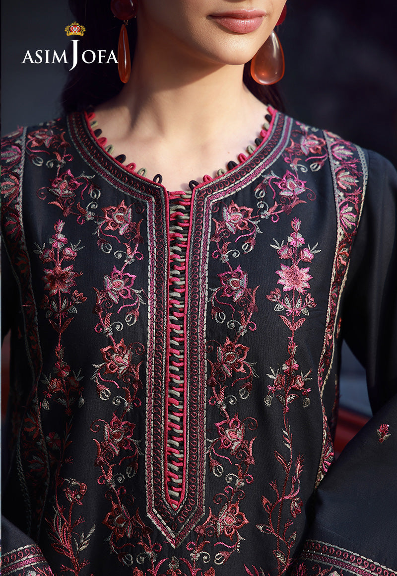 An enchanting midnight crafted for festive grandeur. The black shirt is richly adorned with cherry red, sage green, and rust threadwork, forming a lavish embroidered tapestry that commands attention. Balanced by a chiffon dupatta bursting with vibrant hues, this ensemble is designed for dramatic entrances and unforgettable Eid evenings.