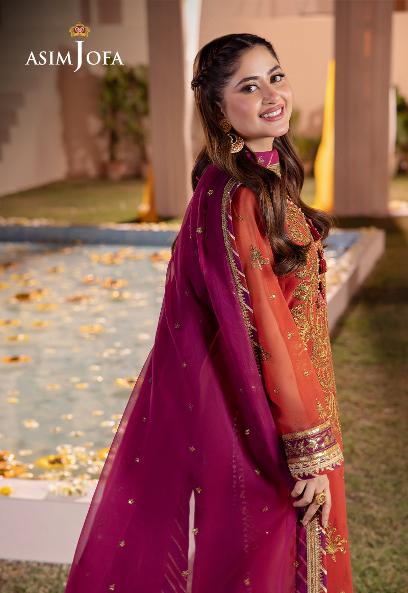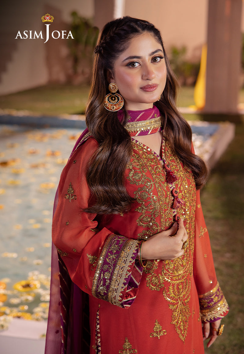 Sajal Aly oozes grace in this captivating design. Shimmery spangles dazzle on rust chiffon base. A straight silhouette is rendered with delicate zari work & spangles ending in a heavy contrast purple border along the hemline replicated in sleeves. It comes with an embroidered chiffon dupatta & dyed trouser.