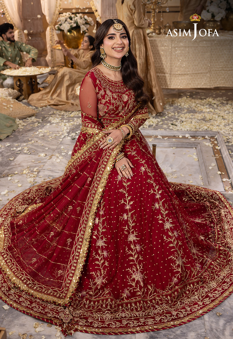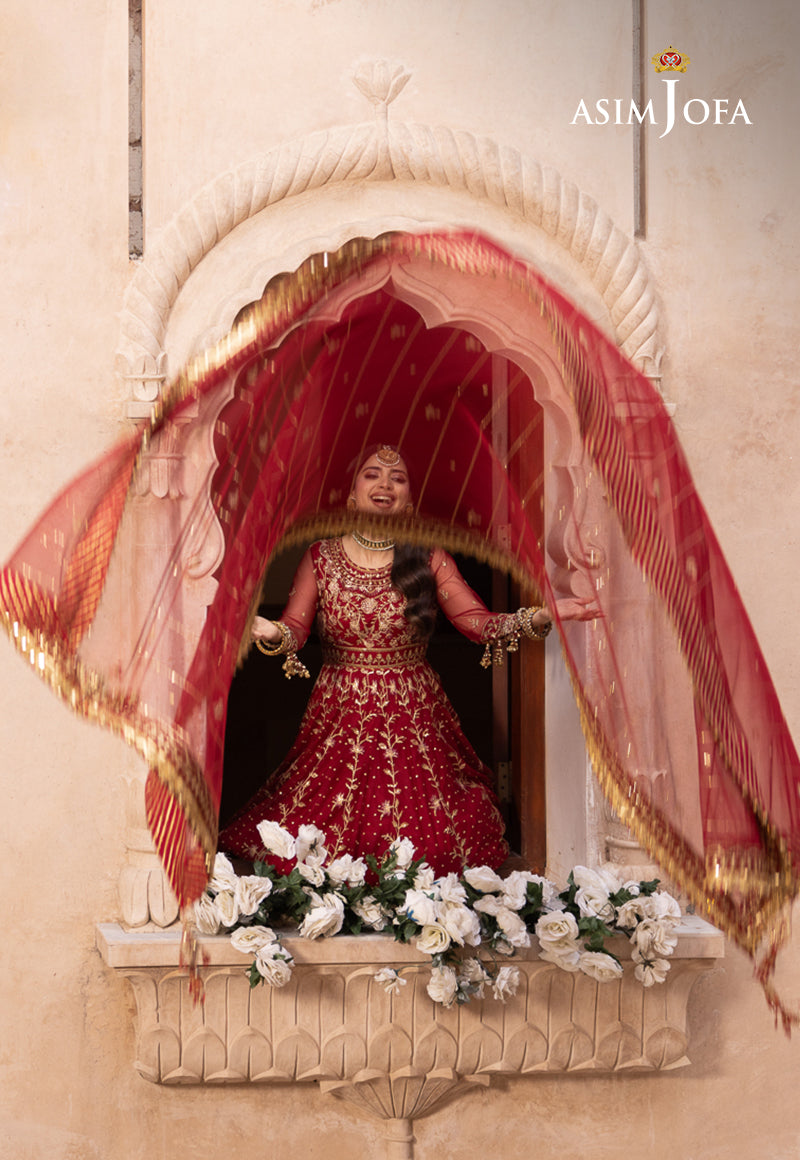Adorn yourself in the allure of our Red Peshwas, a gorgeous piece of art that seamlessly blends tradition and elegance. The gold zariwork embellished with 3mm sequins and intricate floral motifs transforms the peshwas into a canvas of scarlet blooms. The embroidered neckline, bodice and hem create a visual symphony while the embroidered kalis, sleeves with border and the dupatta with four side borders complete this ensemble making it a masterpiece of timeless beauty.