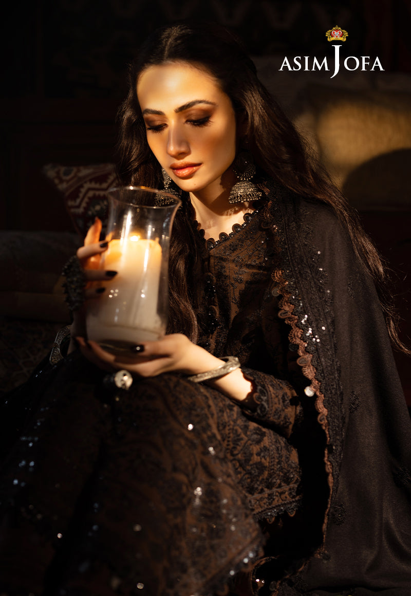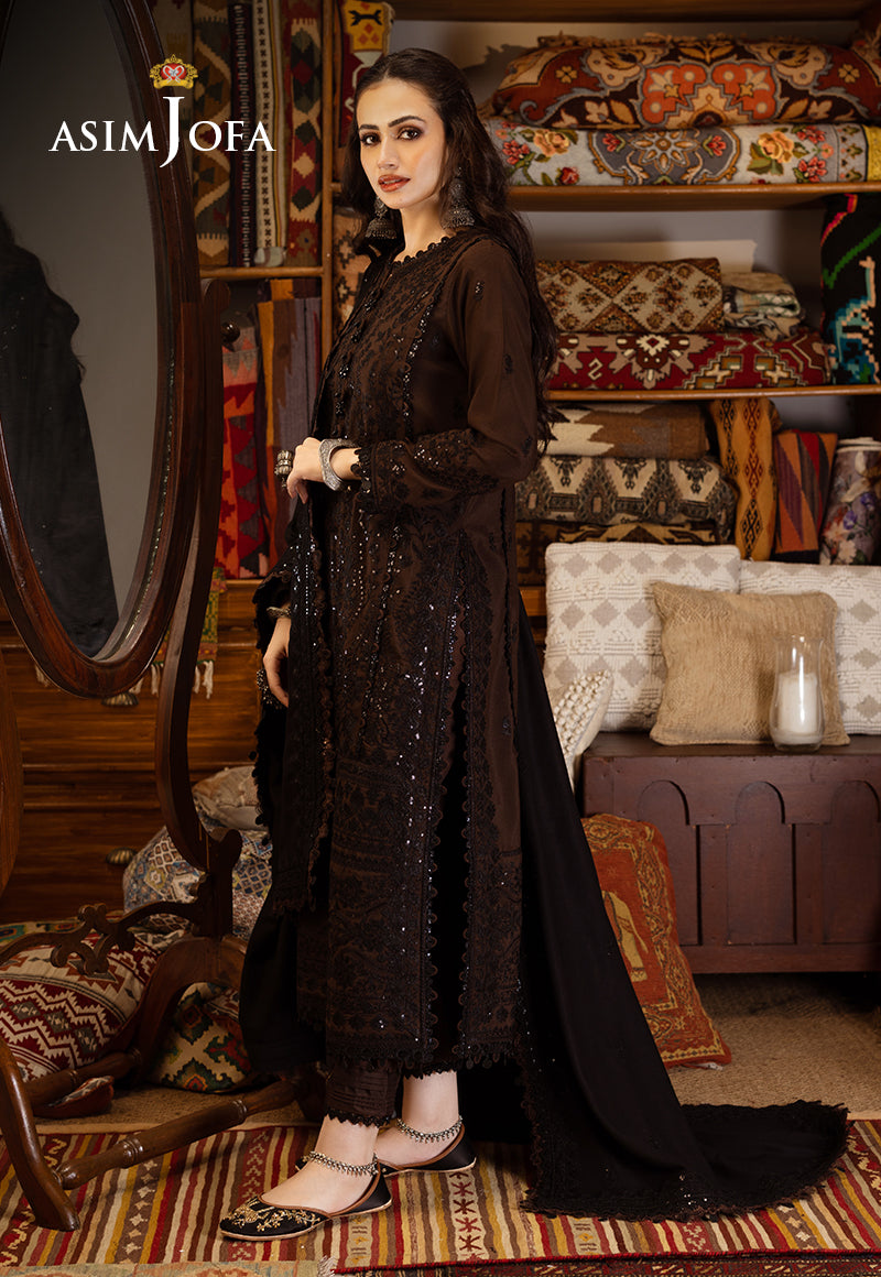 Discover regal elegance with this Brown and Black number. This ensemble is a living tapestry of tradition, woven in shades of brown and black. The intricate embroidery with black thread and black cupped sequins tells a story inspired by the majestic ethnic pattern motifs. Wearing this ensemble, you become a walking testament to the timeless spirit of Kashmir. The embroidered borders are a visual tribute to the enduring heritage of the region. This ensemble is a tribute to the captivating spirit of Kashmir and its timeless beauty.
