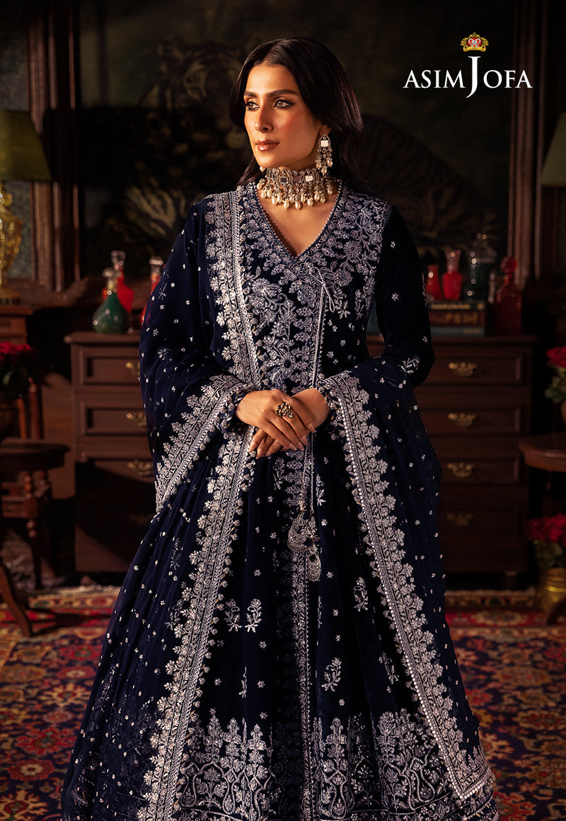 Enter a realm of velvet nights and silver whispers with this navy blue angrakha. The embroidered kalis weave tales of tradition, embellished with silver zari and cupped sequins that glisten like celestial bodies. The velvet anghrakha is a canvas of elegance which envelopes you in its richness. Embroidered sleeves with borders and an intricate ghera border contribute to the poetic dance of design. Bunches of embroidery adorn the neckline while the back neckline and front border tell stories in silver threads. The four-sided embroidered dupatta borders echo the enchantment of a starlit sky, making this outfit a manifestation of nightfall's grace.