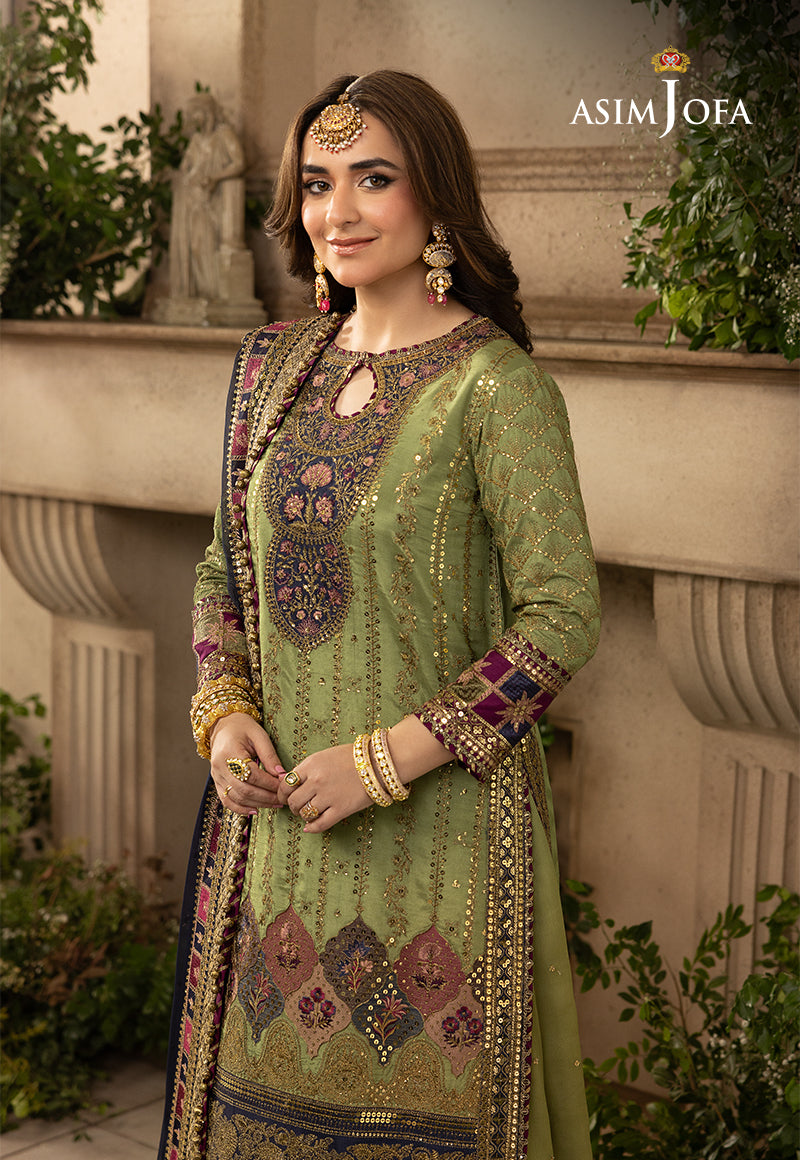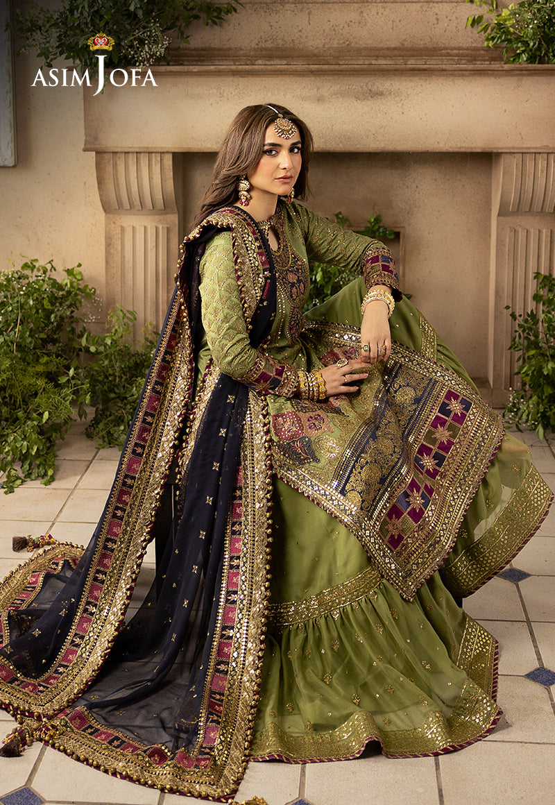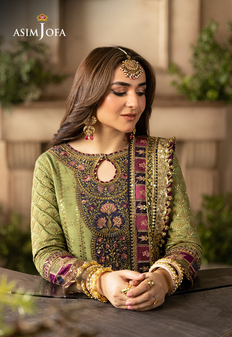 Embark on a journey through the enchanting dreamscape of "Khwab-E-Naubahar," where Fresh Green blooms amidst the mystique of a Midnight Blue dupatta. This ensemble is an alchemy of antique gold zari with 3mm & 5mm sequins and is a poetic reverie. Envision a grand neckline as a gateway to a world where polychrome embroidery on the shirt and sleeves paints tales of whimsy. The sleeves are a canvas of embroidered jaal and borders, unveiling a dreamscape within. The gharara is an ethereal dance of embroidered fantasies and the dupatta with borders beckons you into a couture realm, where each creation is a lullaby sung by the stars.