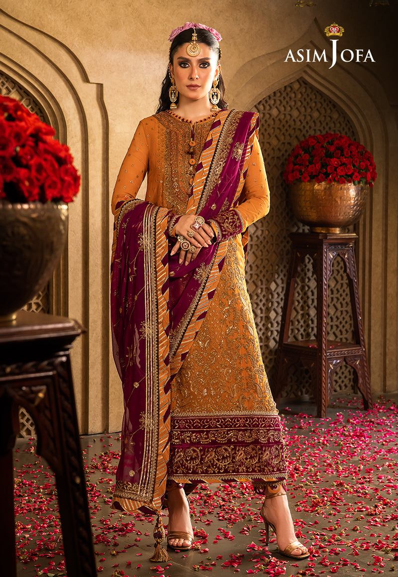 Prepare to be enchanted by a masterpiece of art that perfectly complements your aura. In the captivating hues of Raw Sienna and Plum, this ensemble boasts zariwork and doriwork, intricately woven with plum and rust threadwork adorned with the mesmerizing gleam of copper-colored cupped sequins. The daman and sleeves hem border in striking contrast are lavished with sumptuous Velvet adding a touch of opulence. The motifs, like whispers of floral designs form a rhythmic pattern is a testament to intricate craftsmanship. Completing this regal ensemble is the Plum dupatta, a beacon of elegance that adds the final touch of grace and beauty.