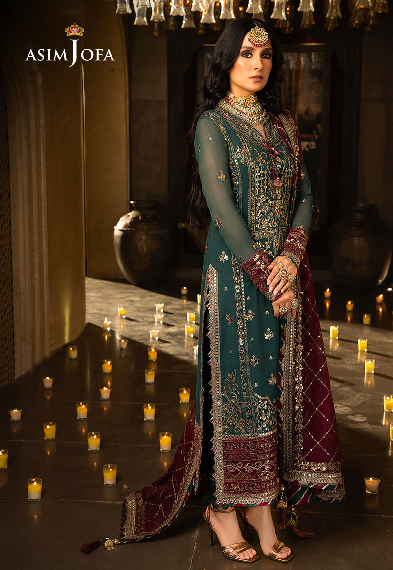 Dive into a world of serenity and elegance, where the hues of Viridian Green and Deep Pink blend with the grace of subtle gold accents. This ensemble is a masterpiece of tasteful attire ensuring you are a beacon of timeless elegance. Adorned with delicate 5mm antique gold sequins and matching zariwork, it exudes an air of majestic splendor. The deep pink velvet gracing the daman and sleeves borders like a bold stroke on a canvas creates a design that is regal and offers a striking contrast. The deep pink dupatta, sparkling with sequins weaves the old-world charm into the ensemble making it a tribute to timeless beauty.