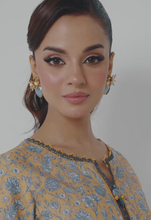 Be mesmerized by the majestic beauty of flora in this 'Asim Jofa Prints' ensemble. The ochre canvas becomes a mesmerizing backdrop for the rhythmic floral print in enchanting blue hues. The digitally printed lawn shirt celebrates the artistry of fashion, while the borders and sleeves add a touch of regality. Embrace the magic of this creation and let your style be an ode to elegance.