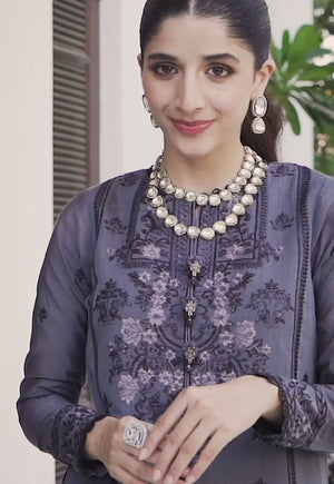 Get ready to make a bold fashion statement with Mawra Hocane in the breathtaking 'ZARI SITARA' ensemble. This shirt, meticulously crafted from paper cotton, features a striking spanish gray color that commands attention. Embellished with shimmering sequins and intricate black threadwork, it exudes an air of opulence. The embroidered panels, and borders add a touch of artistry and finesse. Step into the spotlight and unleash your inner diva donning this exquisite design.