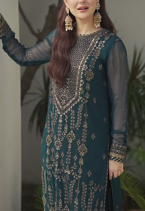 Dive into a world of sophistication with this 'ZARI SITARA' ensemble, worn by gorgeous Hania Aamir. The deep teal chiffon fabric drapes gracefully, while the shimmering sequins and intricate zari threadwork elevate its charm. The embroidered panels tell a story of exquisite craftsmanship. Adorned with sequins and bordered embellishments, the back completes this captivating design.