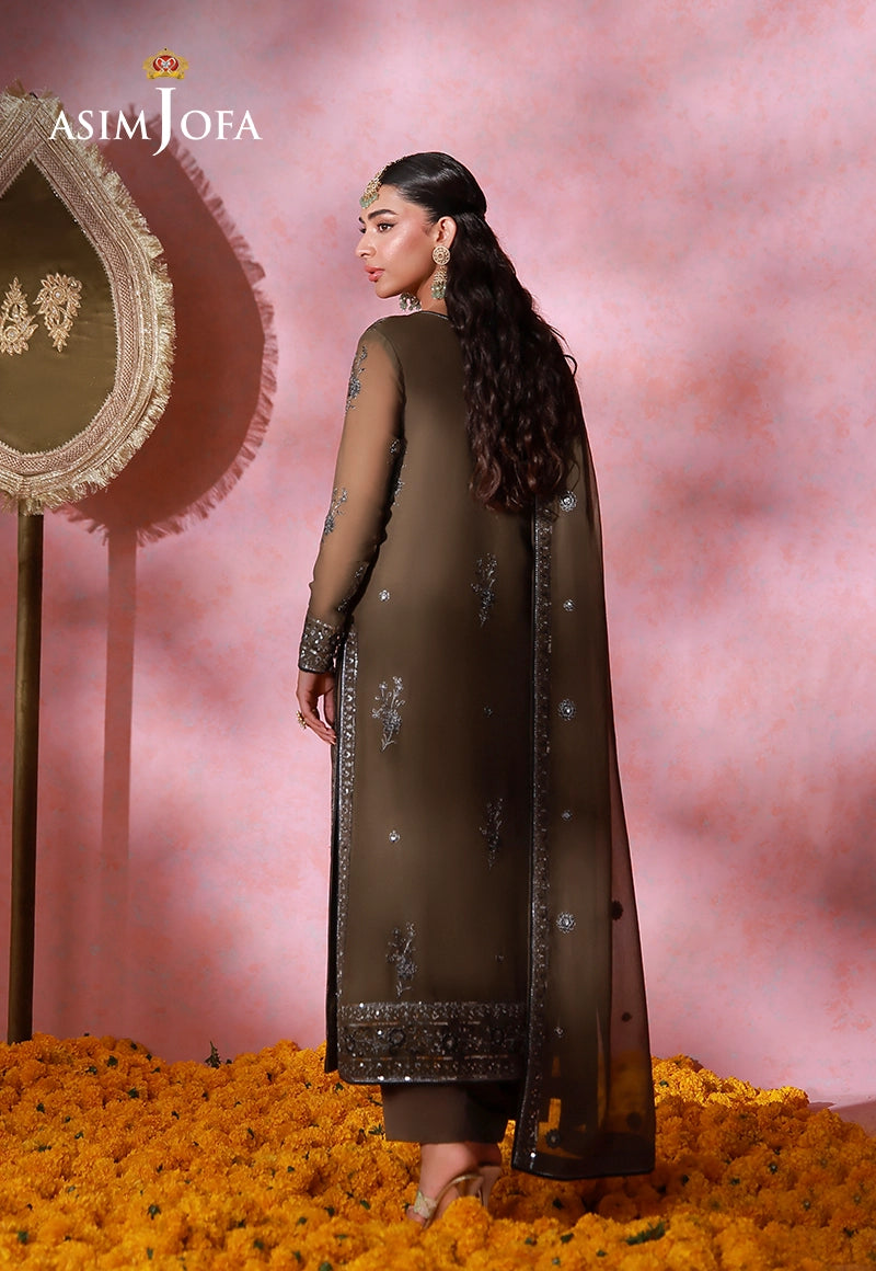 Discover the quiet power of understated luxury in this dirty green ensemble, thoughtfully composed with an air of serenity and refined elegance. The chiffon shirt is richly embroidered in a monochromatic palette, featuring two-toned silver zari, glistening silver sequins, and deep black-hued threadwork that together create a textured, metallic allure. Balanced with a beautifully embroidered chiffon dupatta designed with subtlety and restraint, this ensemble maintains perfect harmony—allowing the wearer to exude a polished, graceful presence at every festive occasion.