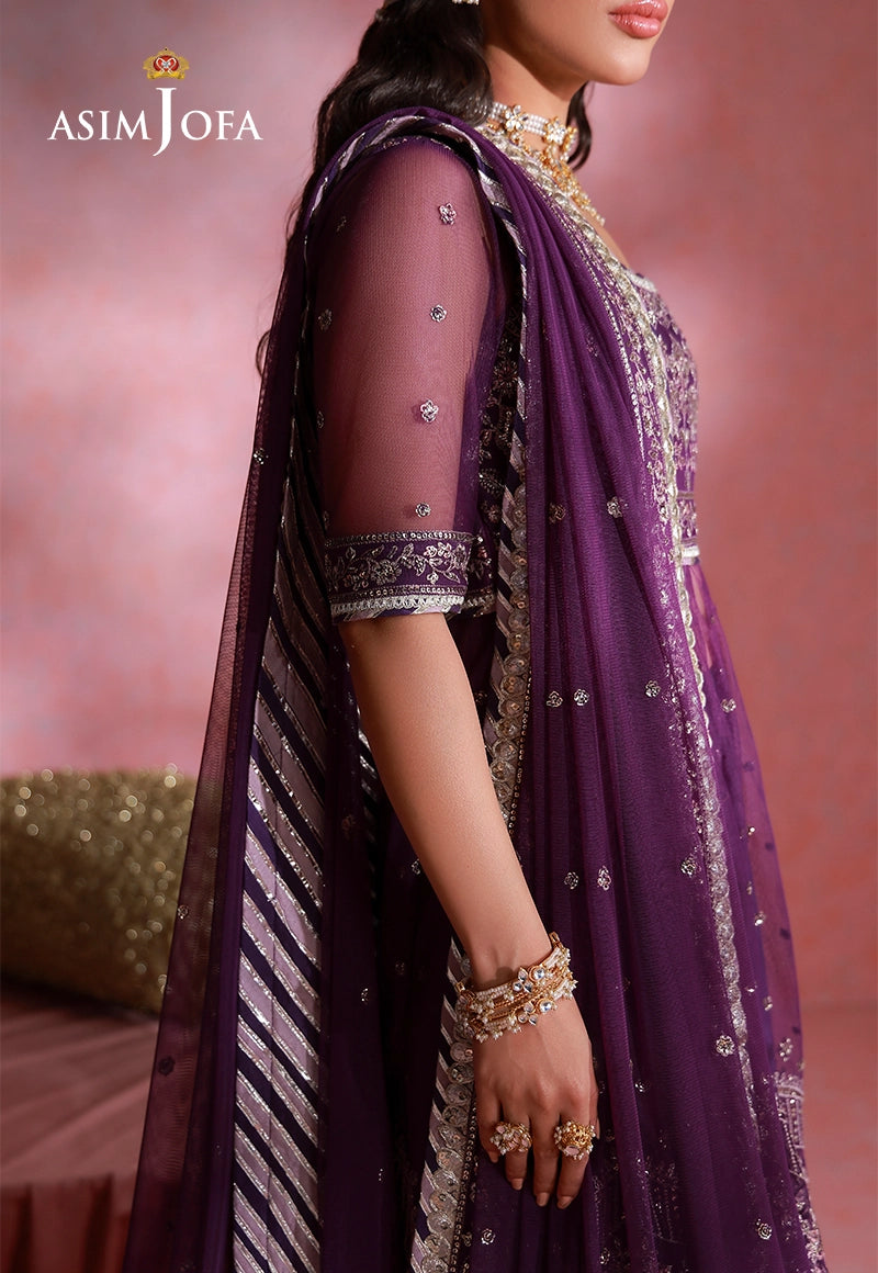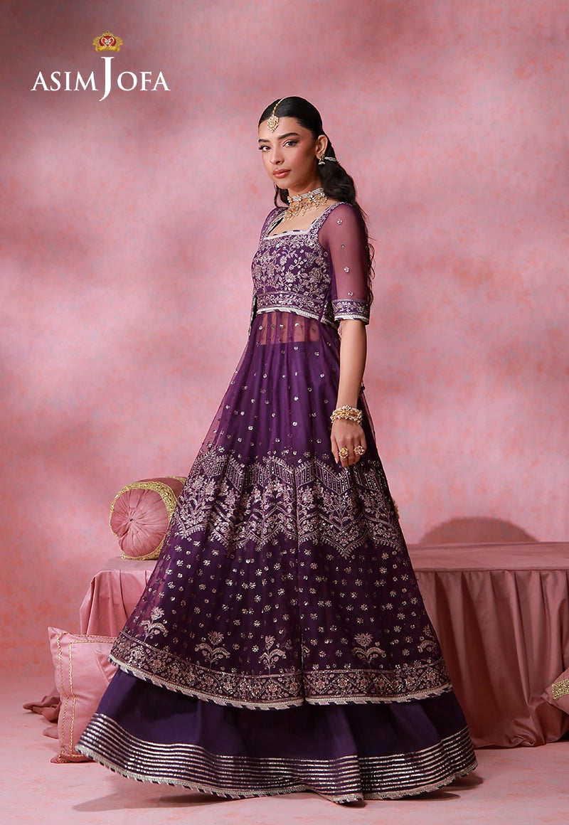 Bathe in the soft, regal glow of this purple peshwas—a silhouette that brings ethereal beauty to life through intricate layering and celestial sparkle. Embroidered with light silvery-gold zari and cupped sequins interwoven with delicate lavender threadwork, the design draws its most opulent focus to the heavily adorned bodice. Beneath a constellation of sequins, embroidered panels unfold in graceful intervals, creating fluid movement and an enchanting sense of magic. Finished with a beautifully embroidered dupatta, this ensemble delivers a truly mesmerizing festive statement.