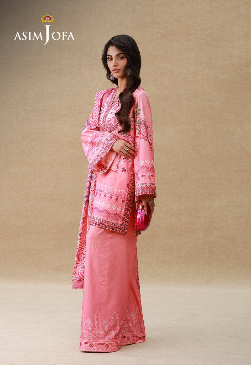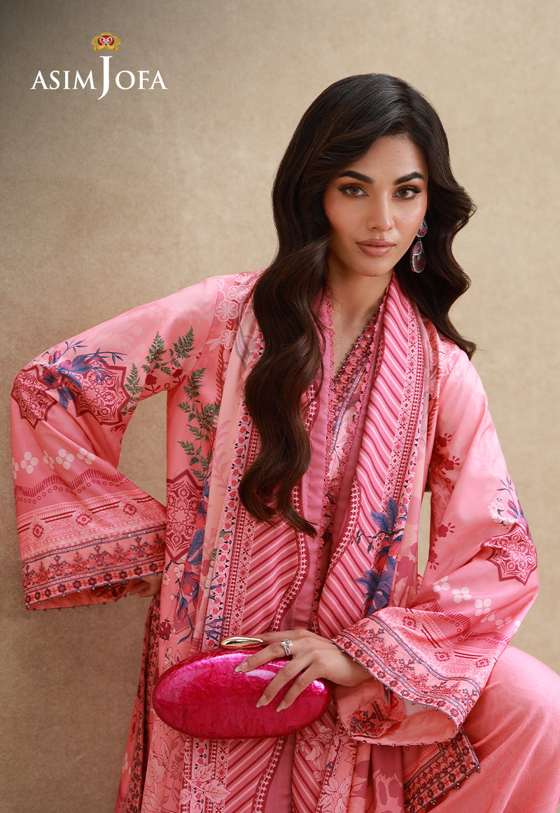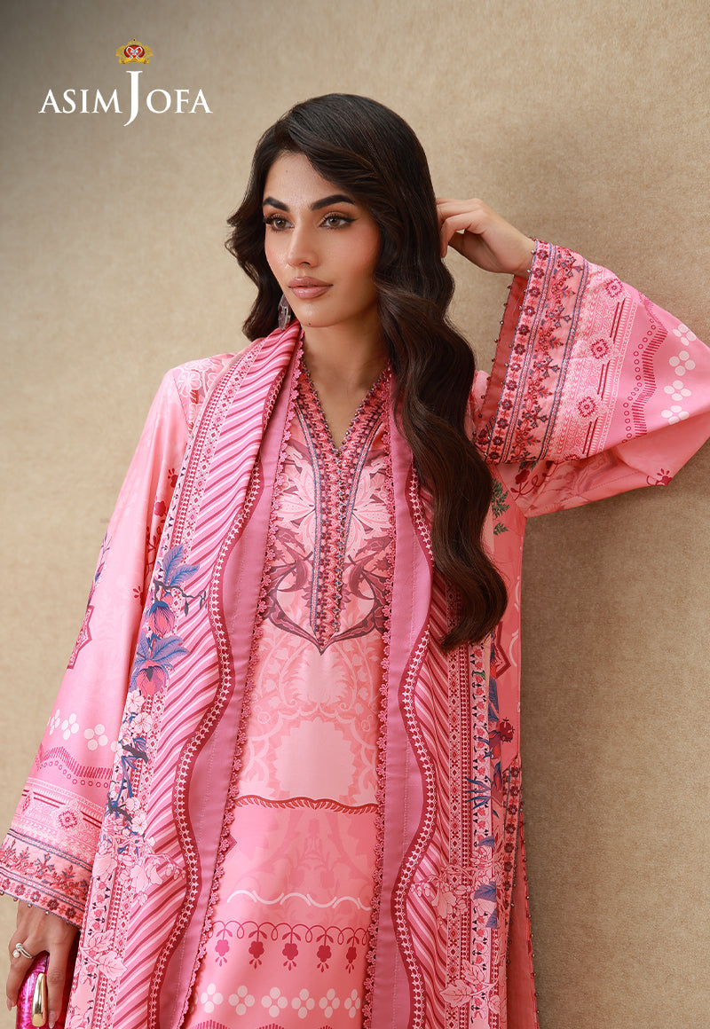 A symphony of a dusky morning, this pink ensemble embodies the essence of florals. The crepe silk shirt features a blend of soft and dark pink hues, printed to perfection, merging like waves into twilight. Subtle floral motifs ripple across the design, adding depth and fluidity. Thread and sequin embroidery adorn the neckline, sleeves, and borders, glistening like sunlight dancing over water. Paired with minimally printed trousers and a digitally printed dupatta that flows like a gentle sea breeze, this ensemble is where serenity meets timeless grace.