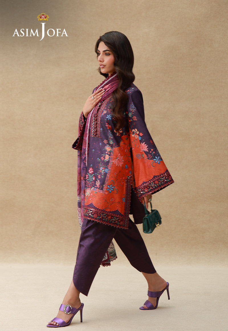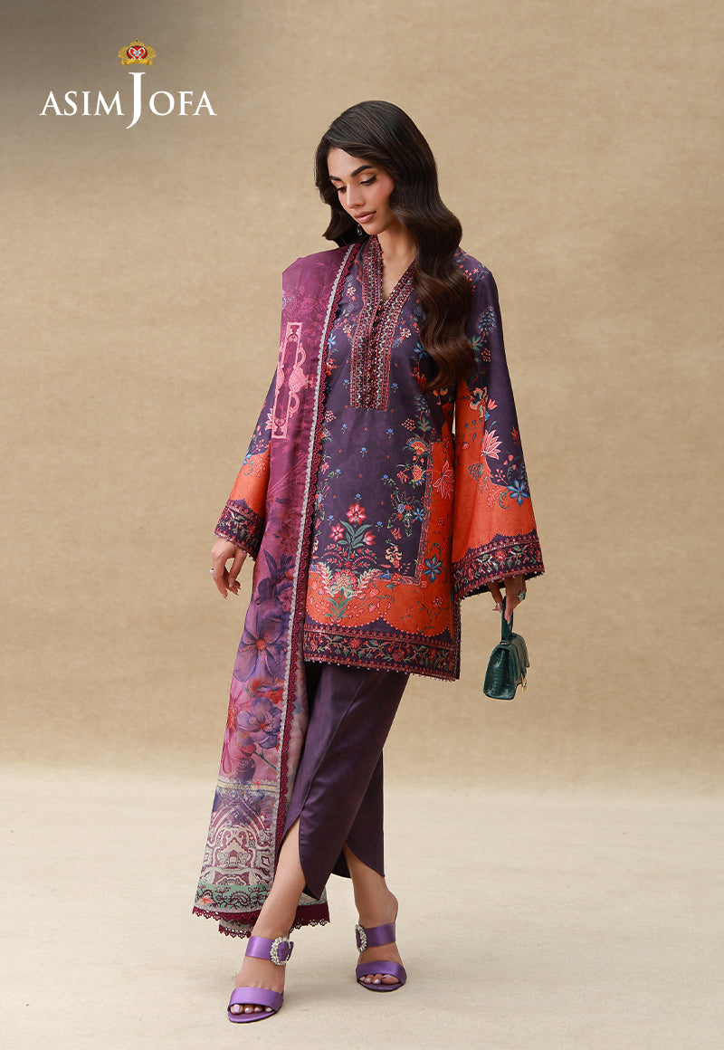 Merging the boldness of aubergine with the zest of tangerine, this purple ensemble is a dream for lovers of striking hues. The crepe silk shirt blooms with a graceful floral print—bold yet soothing, exuding serene femininity like a garden bathed in twilight. Fine thread embroidery and shimmering sequins embellish the neckline, sleeves, and borders, adding a subtle sparkle reminiscent of sunlight dancing on tulip fields. Paired with a digitally printed dupatta that glides like a breath of spring, this ensemble is a refined statement of charm and elegance.