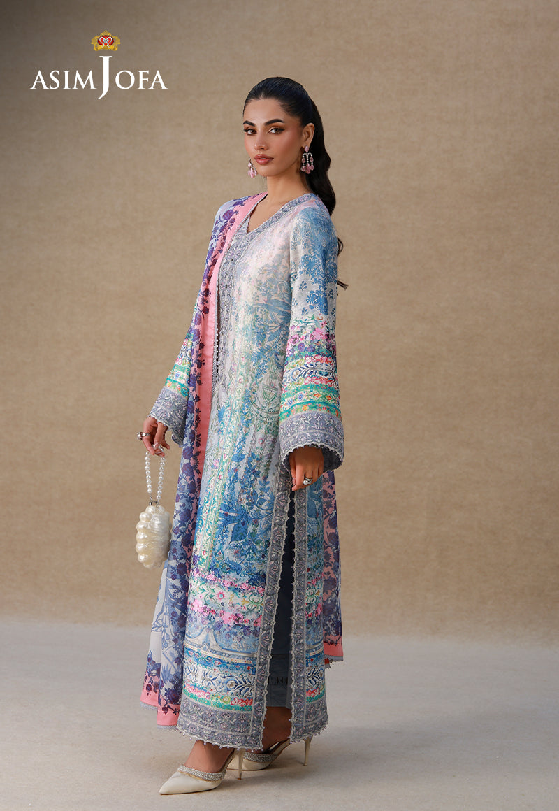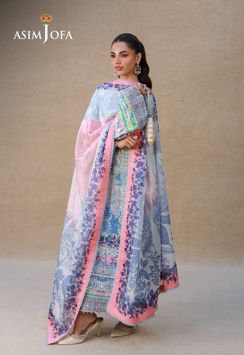 A whisper of elegance draped in blue, this ensemble is poetry spun on silk. The light blue charmeuse canvas unfolds like a vintage painting preserved in an art museum, where the exquisite print narrates a timeless tale. Ornate embroidery in glistening threads and sequins embellishes the neckline, sleeves, and borders, framing the design like pastel accents around a masterpiece. Finished with a digitally printed silk dupatta that drapes like a silken sonnet, this ensemble is an heirloom-worthy expression of finesse for the woman who wears refinement like second skin.