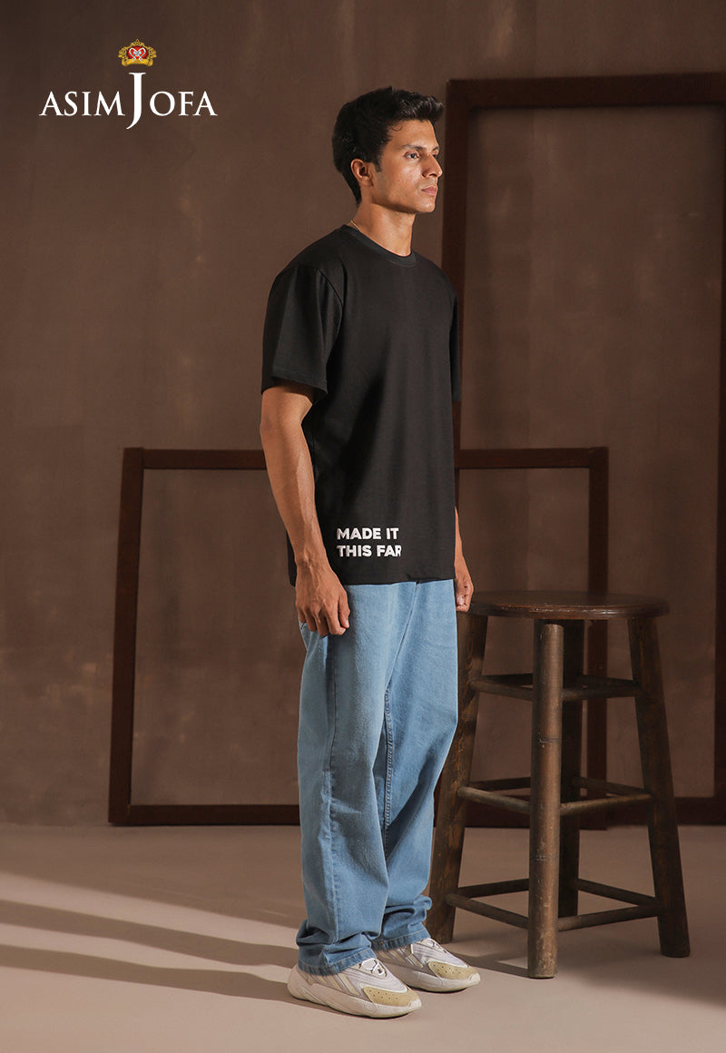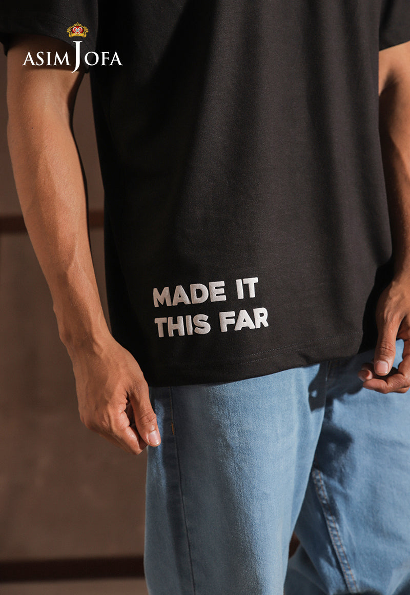 Minimal up top, meaningful down low—this black t-shirt keeps it sleek while telling a story. With the phrase “Made it this far” subtly placed at the bottom hem, it’s a quiet nod to resilience and the journey that shaped you.