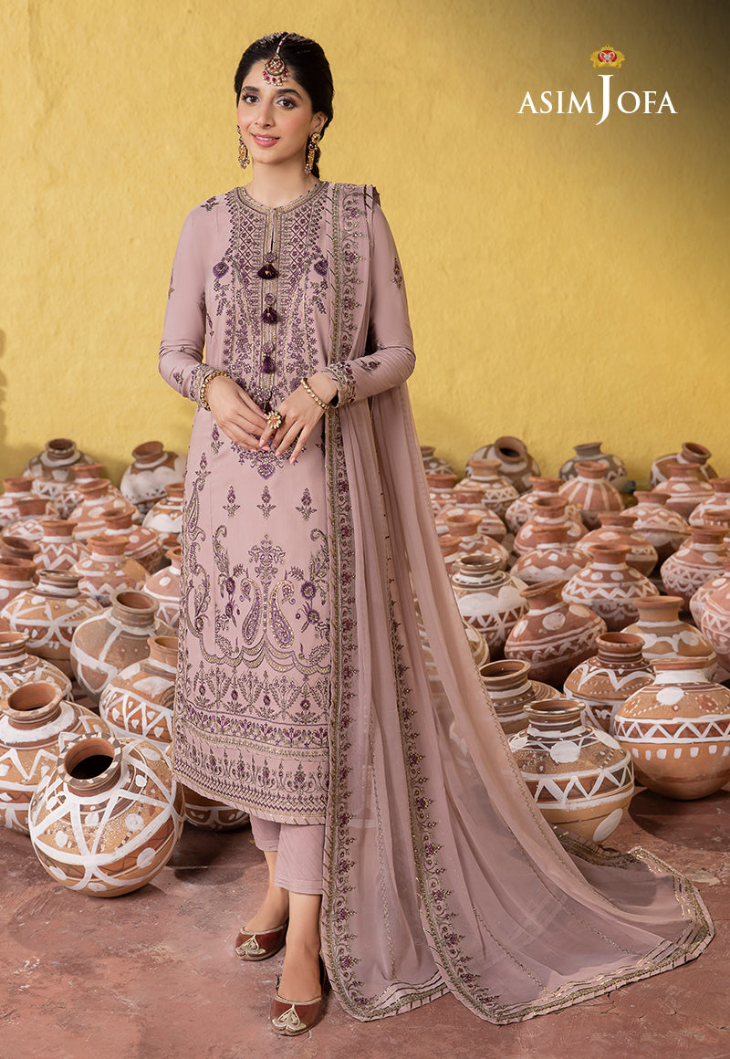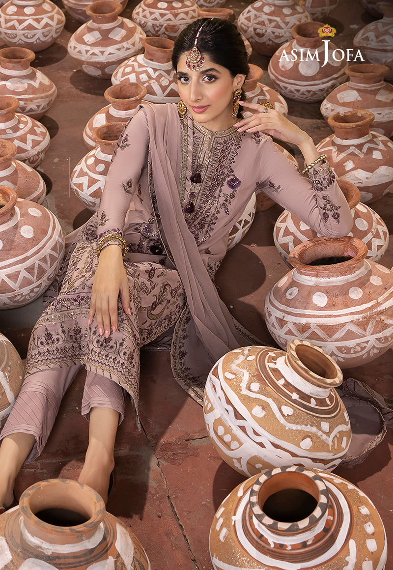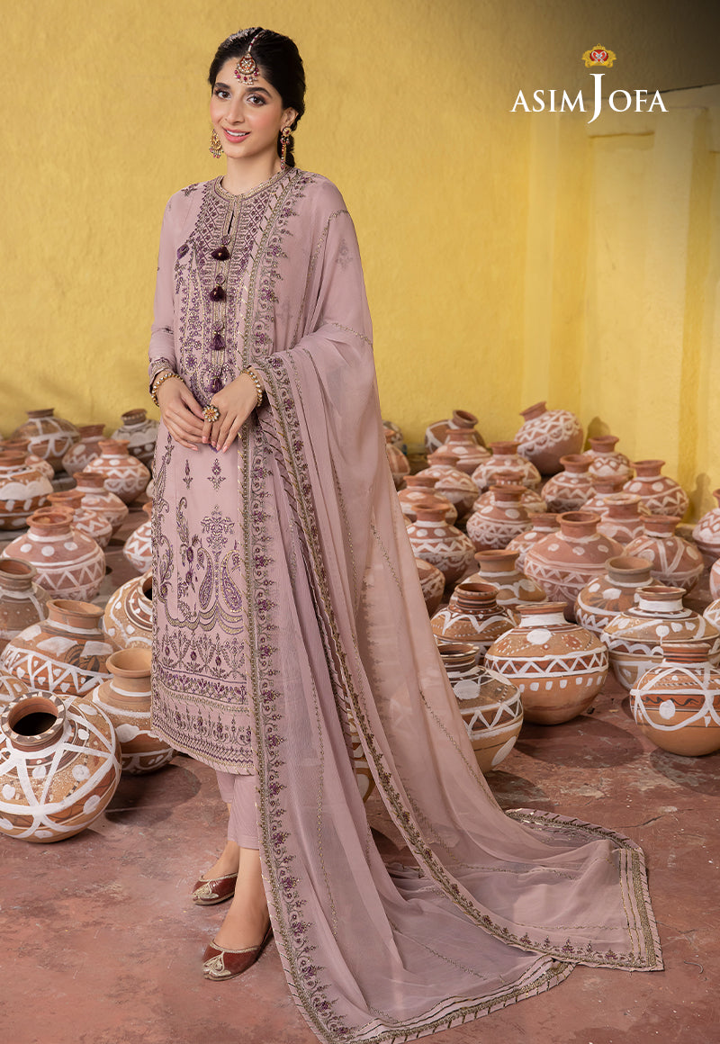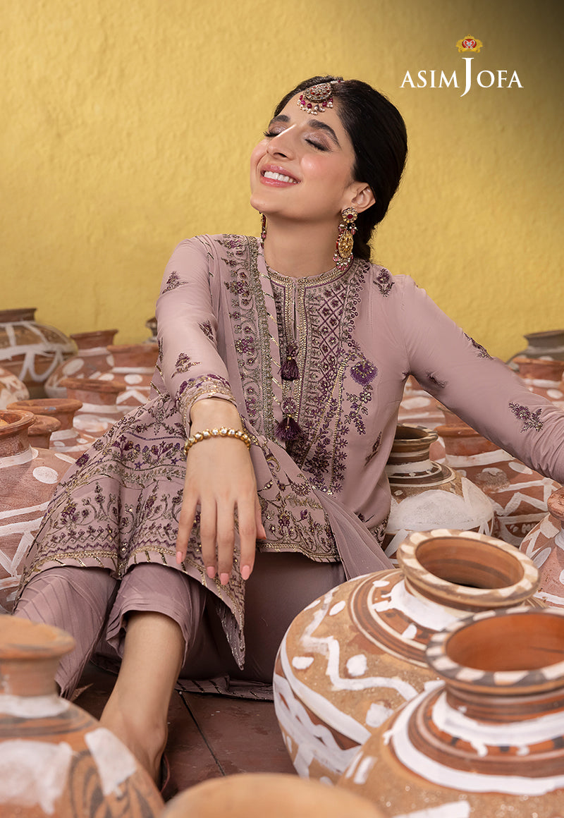 Ravishing Mawra Hocane oozes cultural elegance like a floral symphony in this lilac ensemble from Asim Jofa's 'Abresham Collection.' This design blooms with zari, threadwork and art nouveau-inspired motifs resembling a garden in full bloom. This heavily embroidered piece adorned with dark purple threadwork, luminous zari, and sequins, is a masterpiece of elegance. It comes with embroidered dupatta & dyed pants.