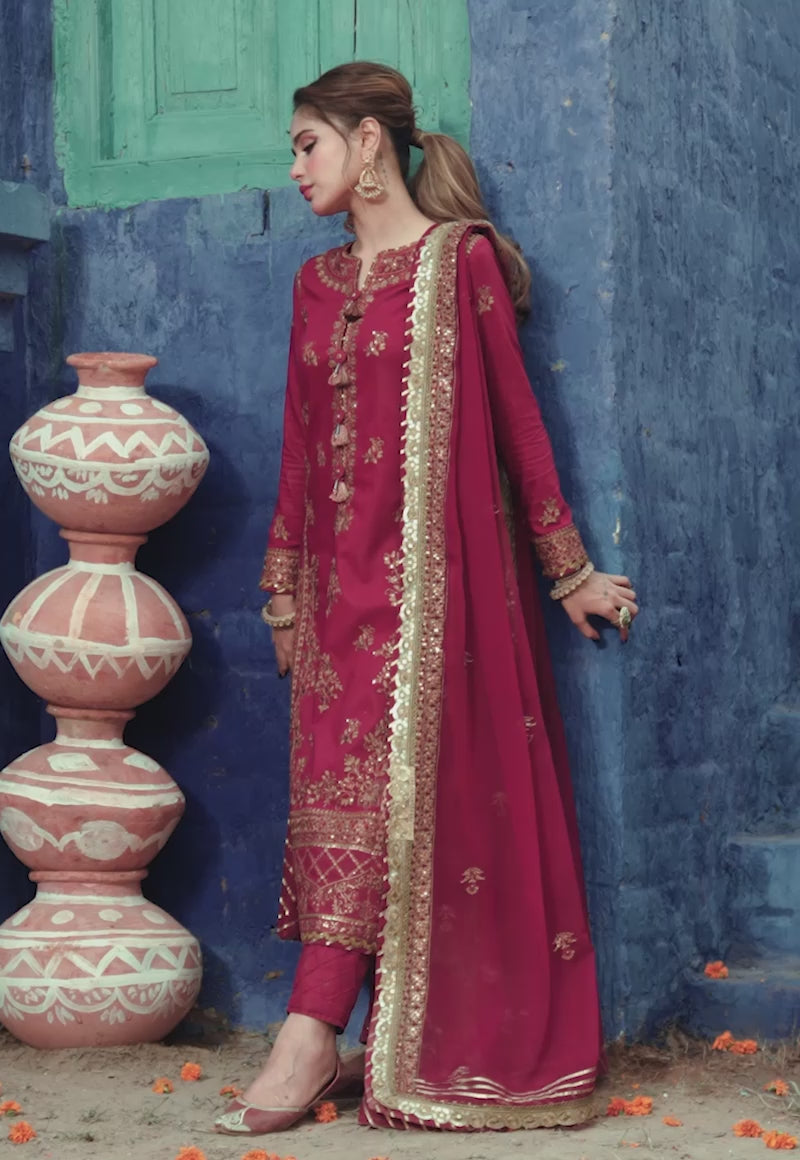 This maroon hued ensemble from Asim Jofa's 'Abresham Collection' is a celebration of regal festivity. Crafted from premium fabric, it features intricate zari worked with golden sequins, and meticulous threadwork which add notes of opulence to this cultural masterpiece. The embroidery creates a design that resonates with cultural festivities. An embroidered chiffon dupatta completes this ensemble, making it an ideal choice for cultural and festive occasions.