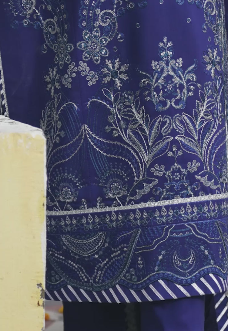This classy navy blue ensemble donned by Mawra Hocane is a dreamscape brought to life from Asim Jofa's 'Abresham Collection.' The design is a portal to a world of baroque and floral wonders. The shimmering zari, sequins, and threadwork create an aesthetically pleasing symphony. The complementing dupatta is like a gentle breeze under the skyline, making this ensemble a true work of art.