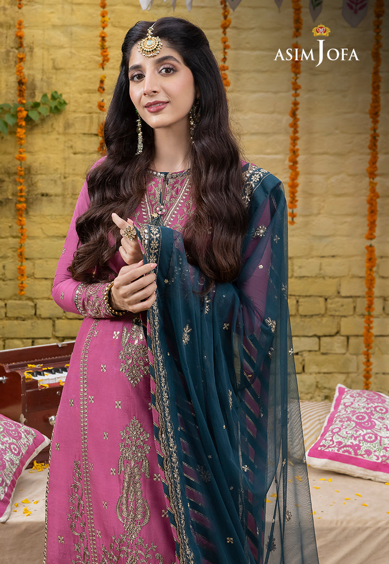 In the 'Abresham Collection' by Asim Jofa, Mawra Hocane whispers the secrets of spring through this rose pink and teal ensemble. This pink shirt is embellished with two toned mink zari, dori and sequins, is like a canvas of blooming beauty. Mixed motifs inspired by baroque and acanthus elements evoke the essence of nature. The teal dupatta is adorned with a splendid border and floral motifs are a testament to the season's rejuvenation.