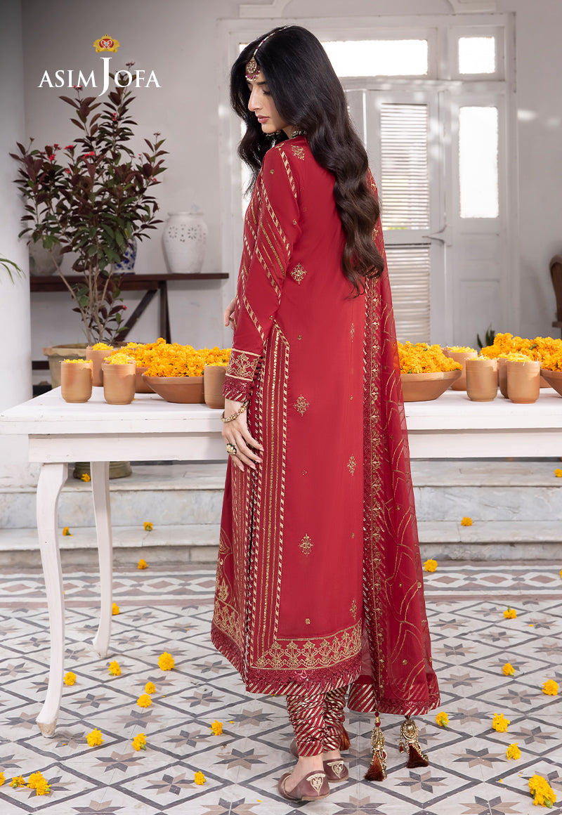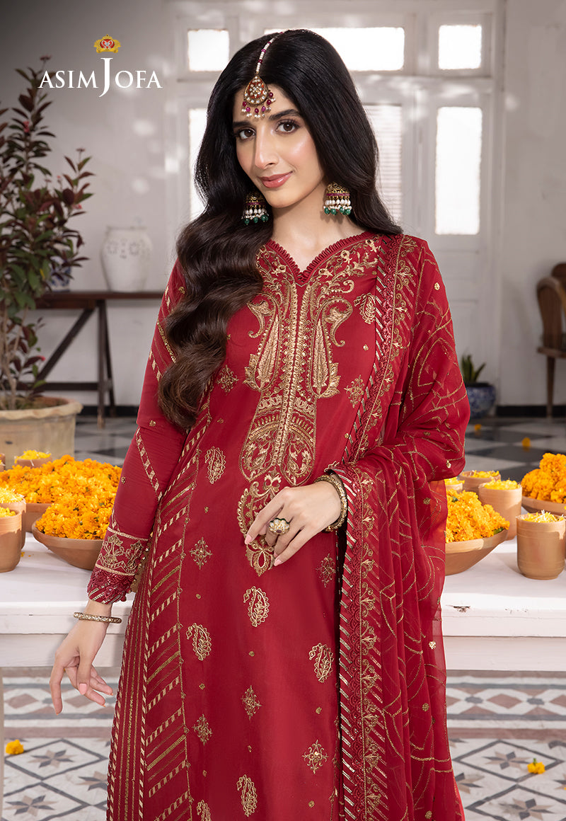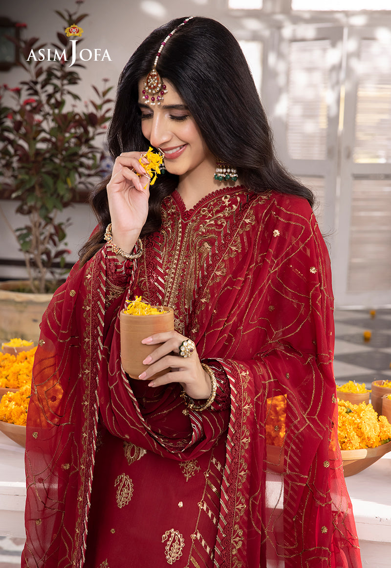Step into the world of the alluring Flamenco with Mawra Hocane in the red number from Asim Jofa's 'Abresham Collection.' This attire is a fiery dance of color and artistry, it features striking design with golden sequins, zari, and threadwork that add a touch of sparkle and luxury to this ensemble. Perfect for those special occasions when you want to shine.