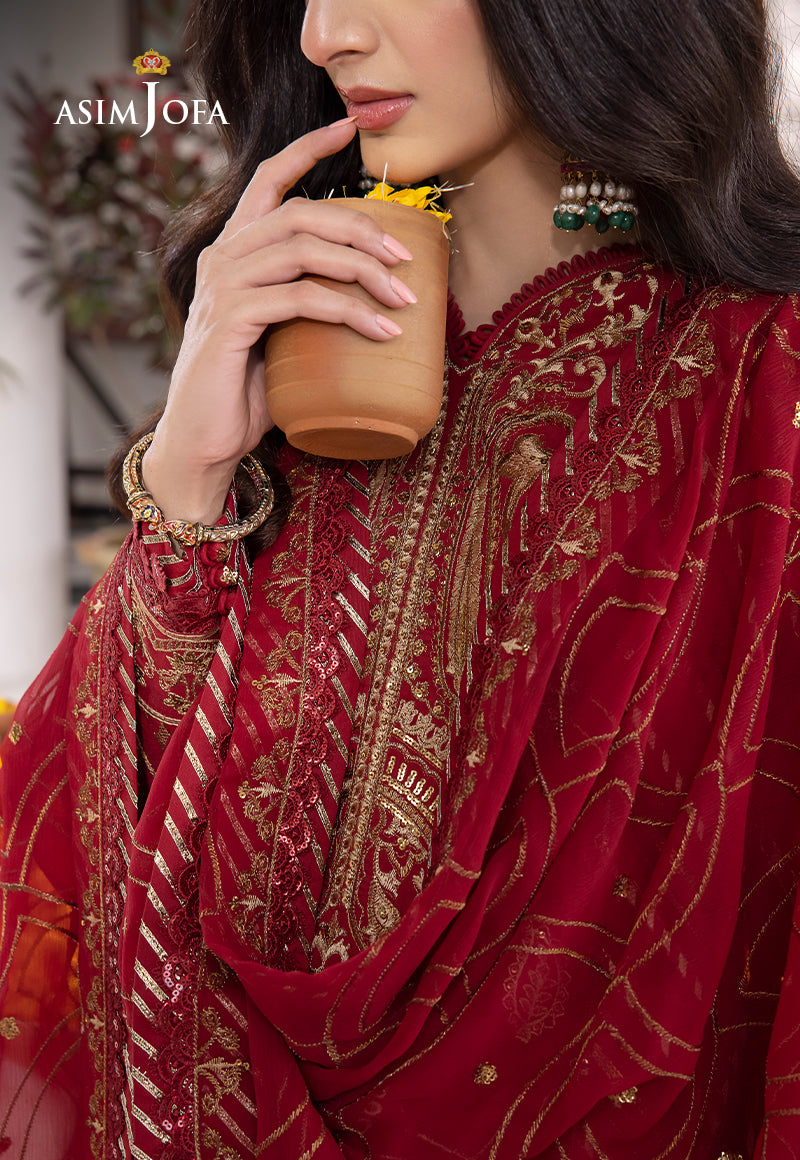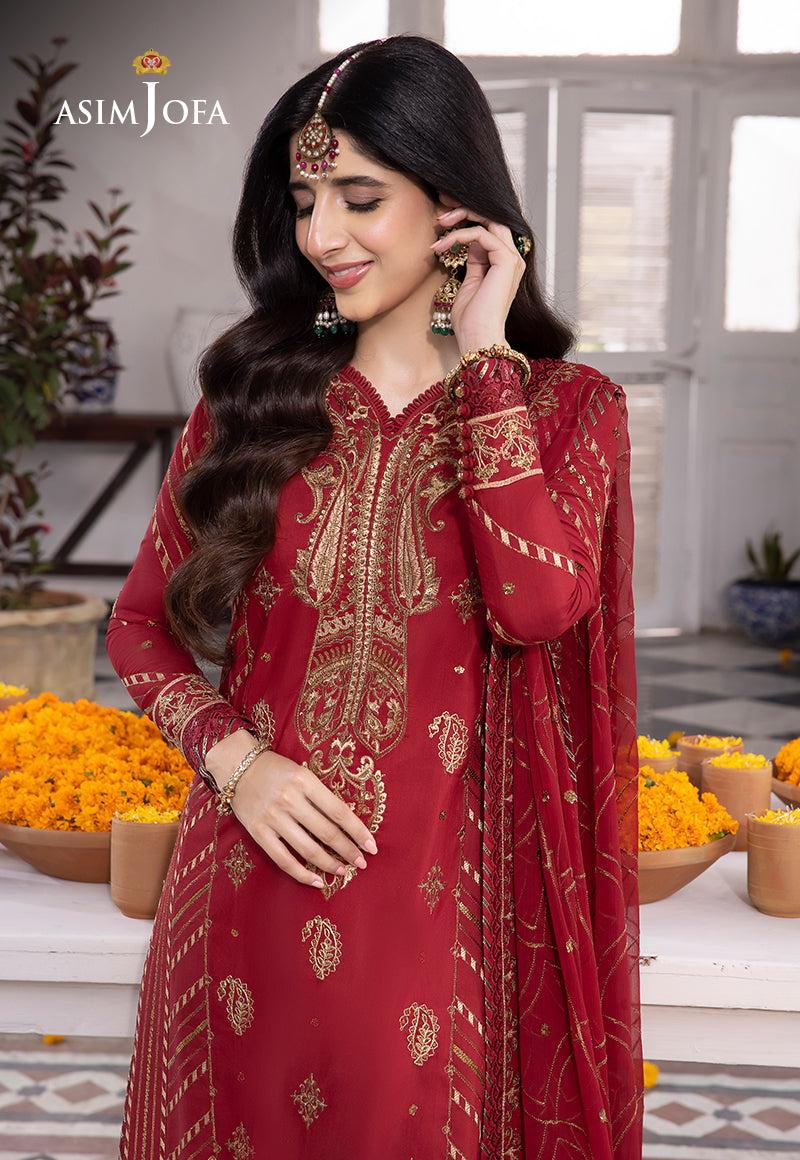 Step into the world of the alluring Flamenco with Mawra Hocane in the red number from Asim Jofa's 'Abresham Collection.' This attire is a fiery dance of color and artistry, it features striking design with golden sequins, zari, and threadwork that add a touch of sparkle and luxury to this ensemble. Perfect for those special occasions when you want to shine.