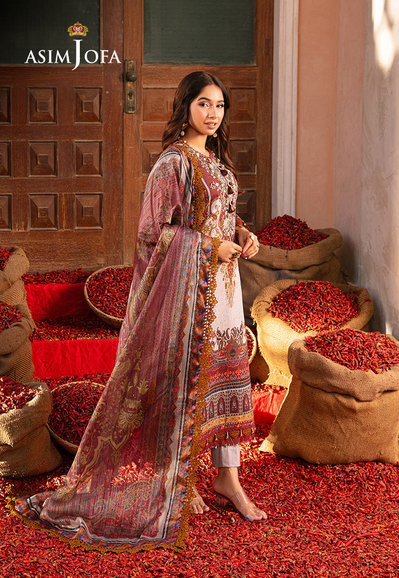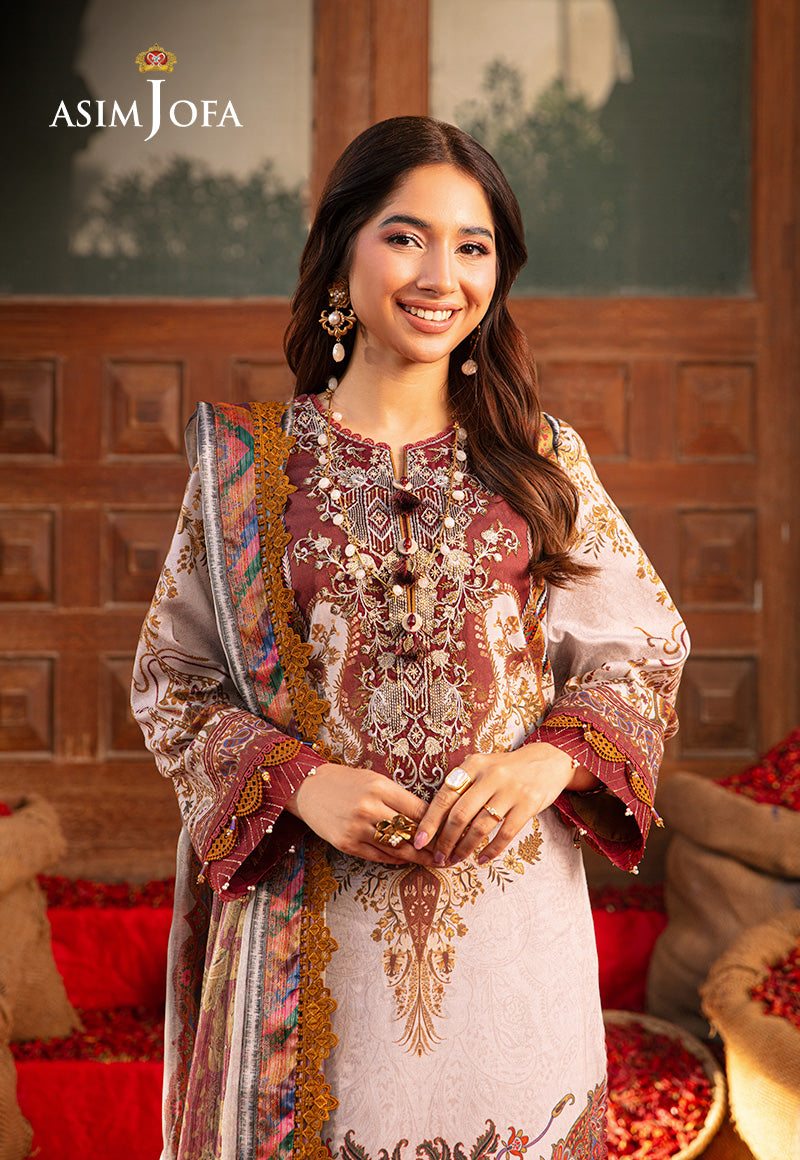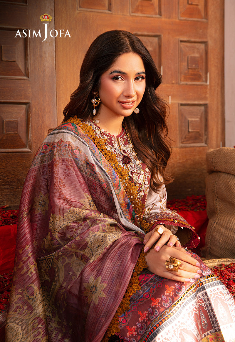 Like a canvas painted with the hues of a lively sunrise, this ivory number from Asim Jofa's “Aira – Summer Print Collection” emanates a vibrant vibe that captivates the soul. The embroidered neckline serves as the focal point drawing the eye to its intricate details. The digital printed shirt adorned with multicolored motifs reflects the playful dance of colors against the fabric. Paired with a maroon digital printed silver mehsuri dupatta, this outfit becomes a symphony of elegance and charm. Let its vibrant energy envelop you, transforming every moment into a celebration of style and grace.