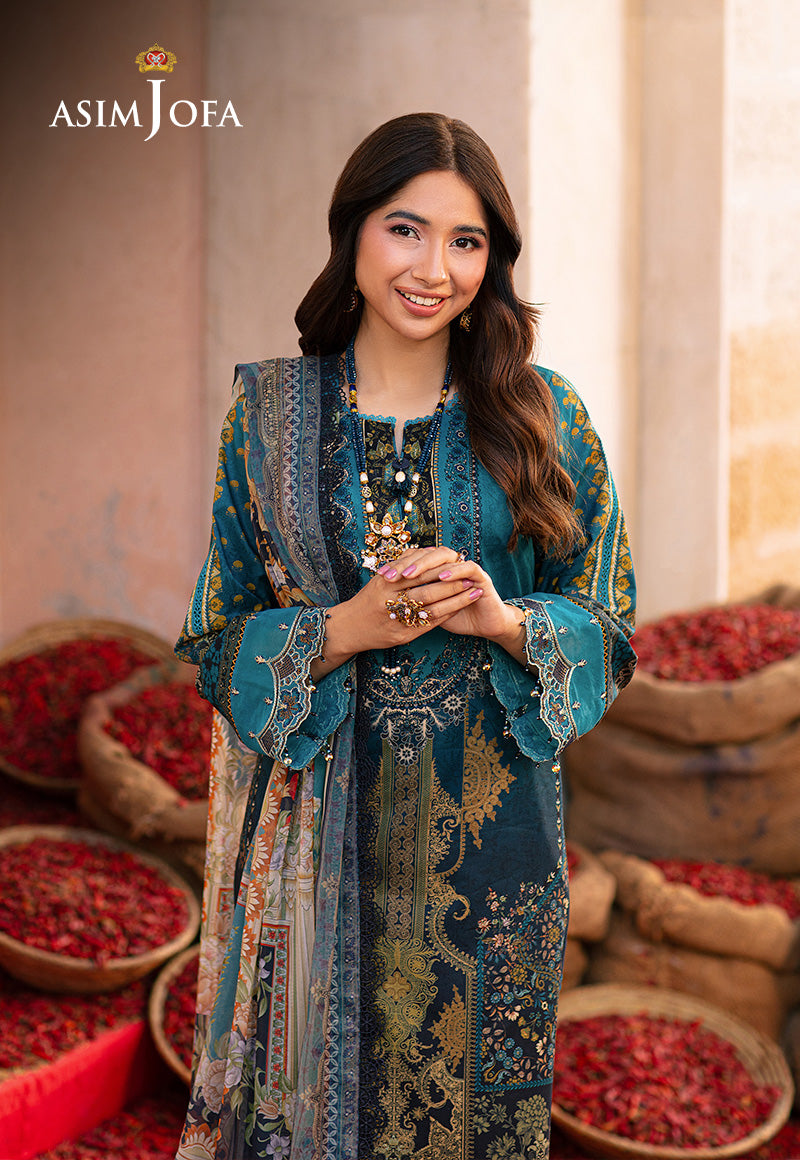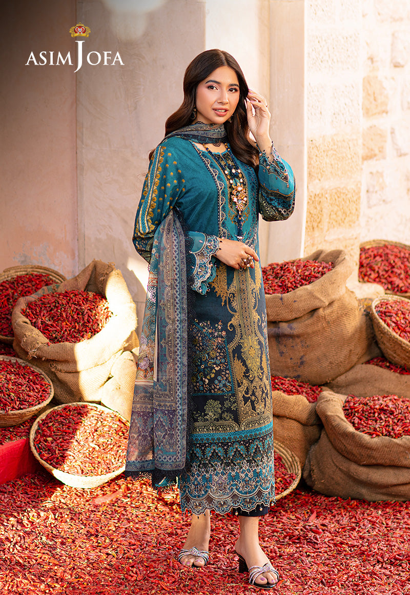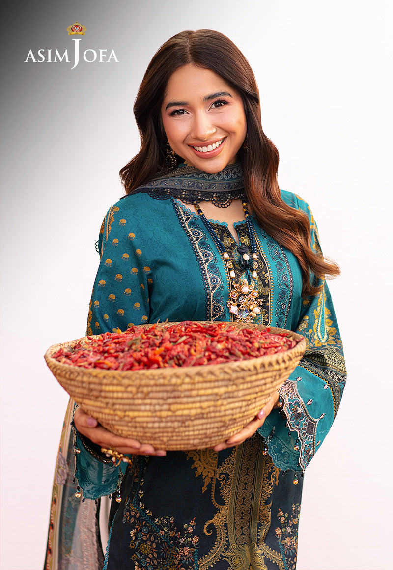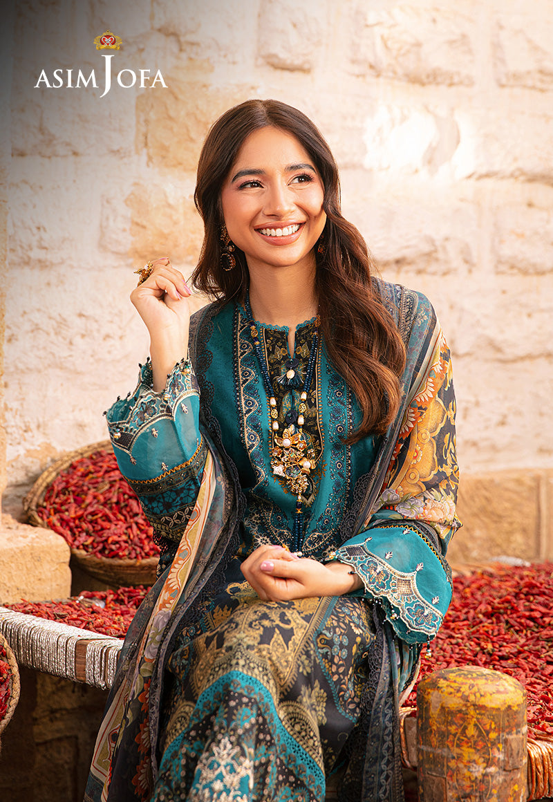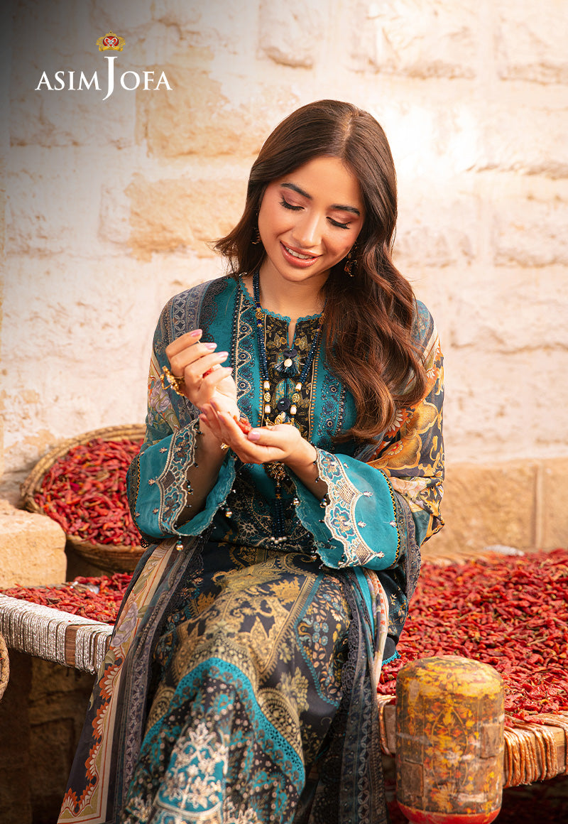 Indulge in the timeless elegance of Asim Jofa's “Aira – Summer Print Collection” with this exquisite ensemble. The shirt features captivating ethnic floral and architectural motifs meticulously crafted in digital print reflecting a perfect harmony of tradition and modernity. Adorned with intricately embroidered sleeves and daman border, this blue number exudes sophistication and charm. The butter silk dupatta adorned with digital prints adds a touch of ethereal beauty to the outfit. As Sabeena Farooq gracefully emanates a lovely vibe resonating with the allure of Pakistani heritage and contemporary chic.