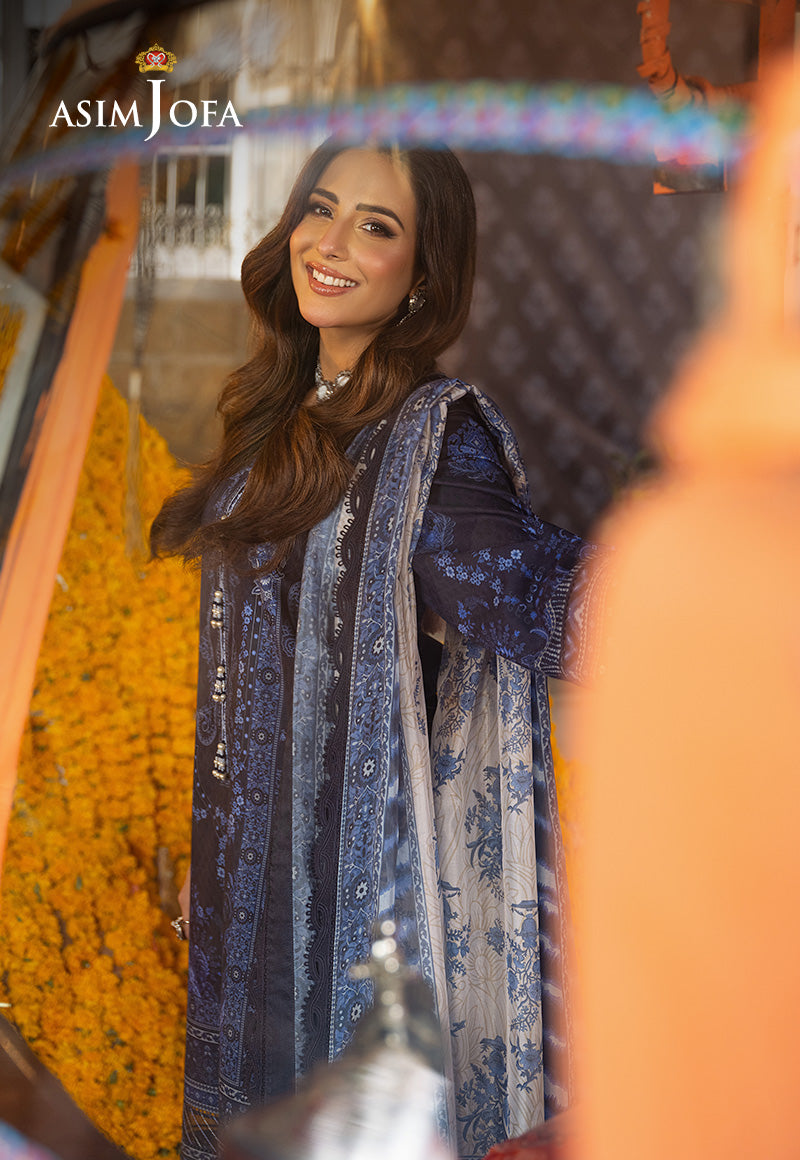 Like the gentle waves of the ocean, this ensemble from Asim Jofa's "Aira – Summer Print Collection" whispers tales of elegance and grace. The embroidered sleeves and daman borders cascade like delicate ripples framing the digital jacquard shirt adorned with hues of blue and pure acanthus motifs. The digital butter silk dupatta drapes softly, echoing the tranquility of a serene seascape. As Ushna Shah graces this ensemble, its elegant vibe becomes a symphony of style and sophistication inviting you to immerse yourself in its timeless allure.