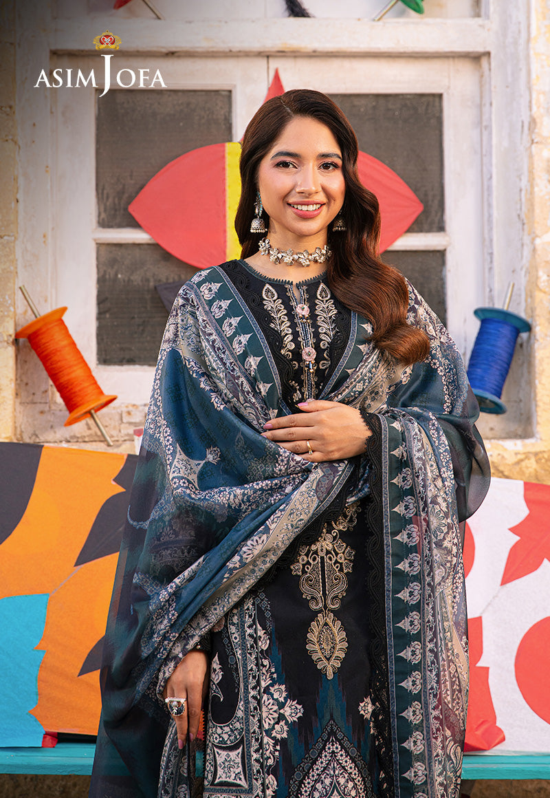 Like a midnight sky adorned with stars, this black number from Asim Jofa's “Aira – Summer Print Collection” bewitches with its celestial charm. The embroidered neckline reminiscent of constellations guides the eye to the digital printed shirt where ethnic motifs dance like fireflies in the night. Wrapped in a butter silk dupatta of teal blue, it's as if the dusk has kissed the darkness infusing it with warmth and radiance. Sabeena Farooq, a vision of grace breathes life into this ensemble transforming it into a mesmerizing ode to twilight's beauty.