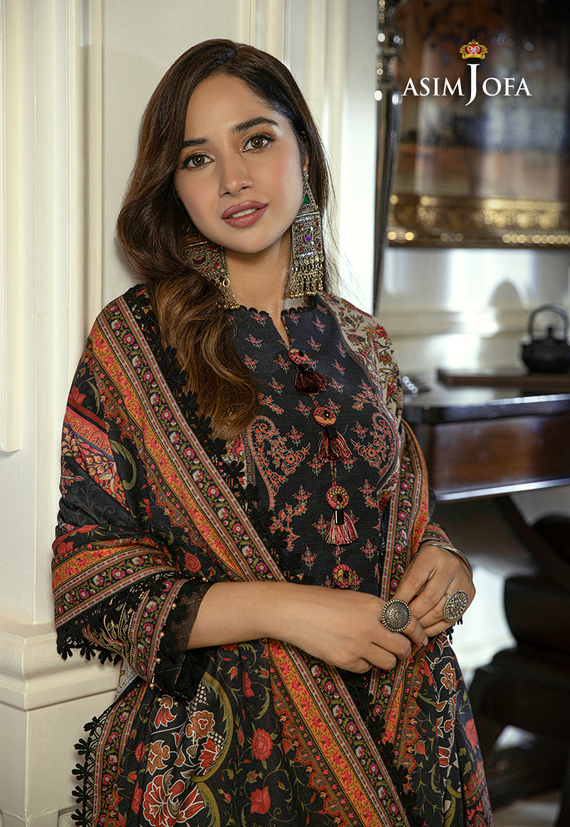 Asra - Winter Shawl Collection presents this artistic and traditional ensemble, a true reflection of timeless flora and paisleys for the winter season. This elegant black attire accompanied by a khaddar shawl is the epitome of understated beauty. This design boasts intricate embroidery and motifs in shades of red, orange, and white gracing the sleeves, and hemline. Drawing inspiration from artistry of the Mughals. The khaddar shawl showcases a captivating floral pattern with a jet-black backdrop and vibrant accents in red and orange, creating a contrast that is as bold as it is chic. This collection celebrates the serene beauty of winter with this truly exquisite outfit.