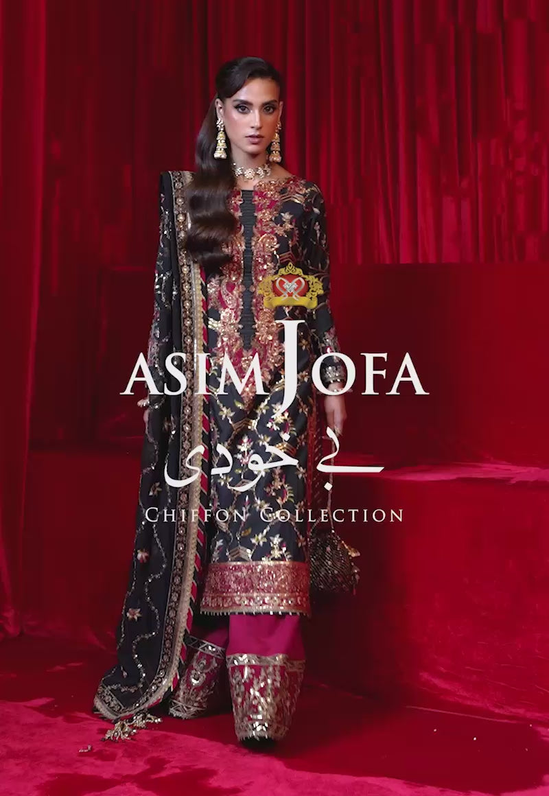 Drape yourself in regal glamour with Asim Jofa's "Be-Khudi" ensemble in striking black and red. The rhythmic pattern adorned with floral and art-nouveau motifs, exudes opulence and charm. The shirt features an intricately embroidered neckline with captivating design while the chaak makes it elegant. The embroidery infuses zari-work with lurex, thread, dori and sequins which enhance the regal aura. The dupatta, embellished with four-side borders, adds a touch of luxury, while the trousers complete this majestic look.