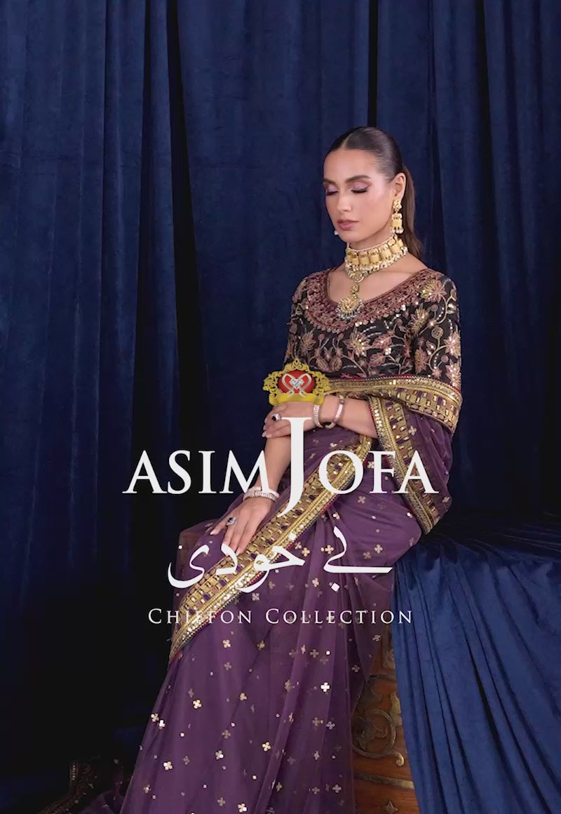 This regal saree graced by the enchanting Iqra Aziz, is a vision in black and purple, evoking an aura of majestic beauty. Crafted with utmost precision, the blouse features exquisite embroidery on both the front and back, showcasing delicate floral motifs adorned by zari, sequins, and intricate threadwork. A finely embroidered belt graces the blouse's hem, adding a touch of sophistication to the overall design. This saree that truly captivates with its shimmering sequins along the borders, exuding a timeless charm that's second to none. You can effortlessly embody royalty in this attire, leaving a trail of awe-inspired admirers in wake.