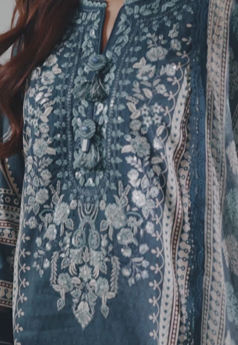 This ‘Asim Jofa Print design is a jewel of art and sophistication. The teal blue ensemble sparkles with elegance and grace with its lawn shirt and organza neckline. The chiffon dupatta is a gem of architectural magnificence, shining a digital print that dazzles the eye. The teal blue color is a reflection of your refined taste and style, making this outfit a precious treasure.