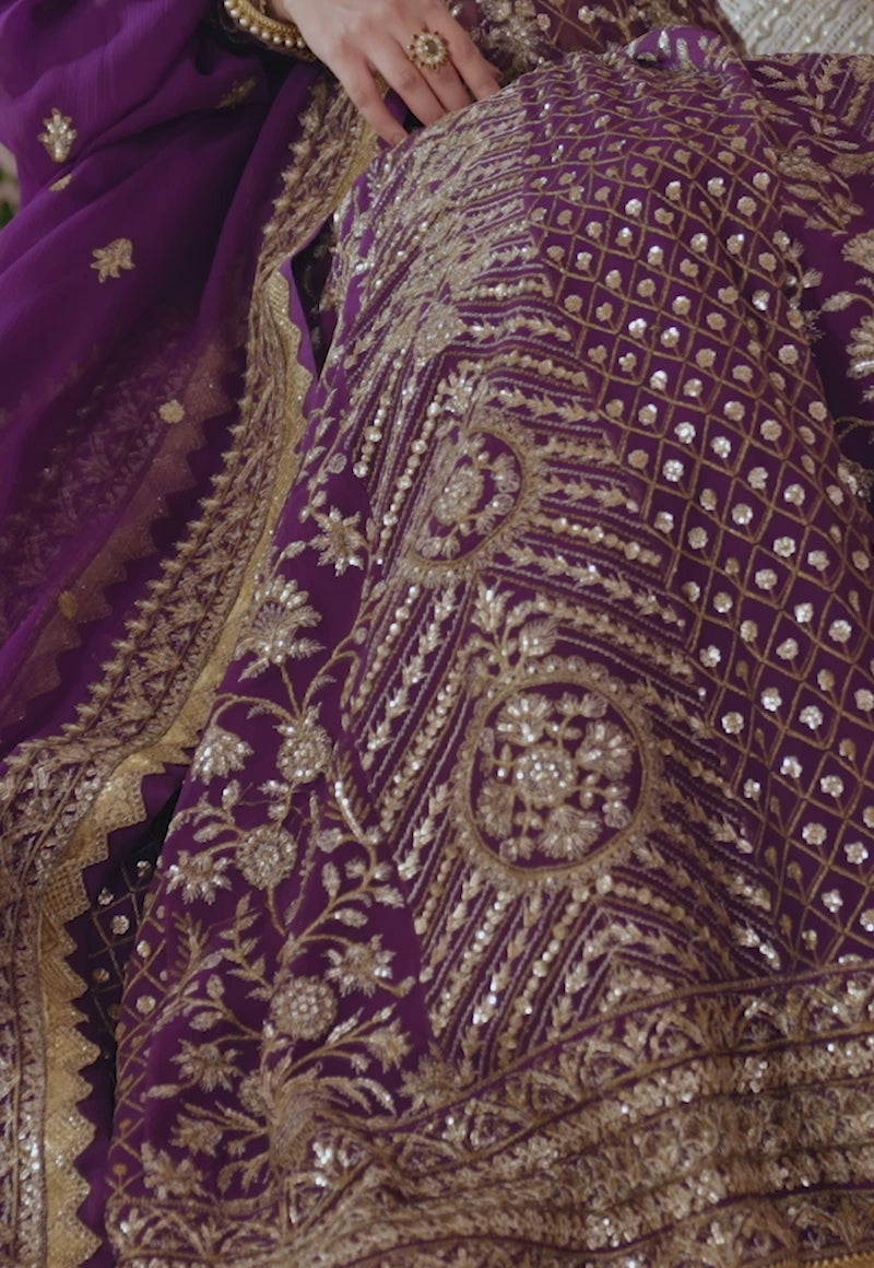 Shine bright with our starlight peshwas, a dazzling creation by Asim Jofa from the “Chandni Collection”. This ensemble sparkles with sequins and zari work like a galaxy sky filled with stars. The embroidery is a story of beauty and elegance, astounding as a brilliant constellation spread across the sky. The purple color adds a sense of mystery and allure to this creation. It is a perfect balance of comfort and luxury, making this ensemble a heavenly choice for any festive occasion.