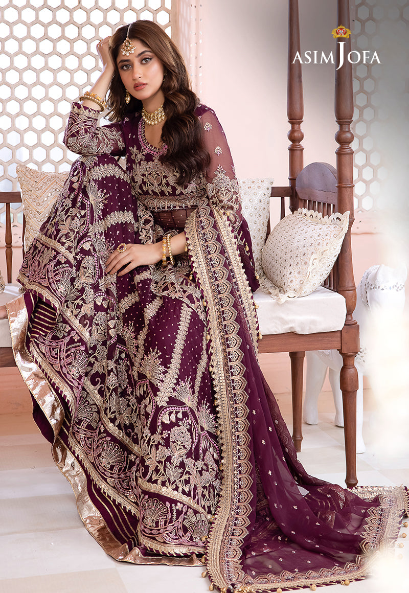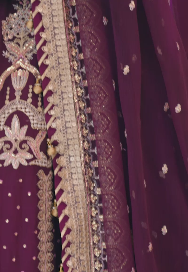 Experience the elegance of the peshwas, a symbol of royal splendor. This masterpiece is embellished with zari, sequins, and fine threadwork, showcasing exquisite craftsmanship. It is a perfect blend of richness and comfort, with a traditional motif featuring architectural arch motifs, paying tribute to our heritage. The embroidered bodice unfurls into kalis that radiate grace. Be the belle of the ball dressed in this “Chandni Collection” plum peshwas by Asim Jofa.