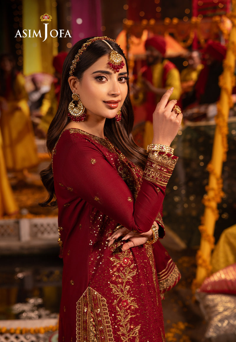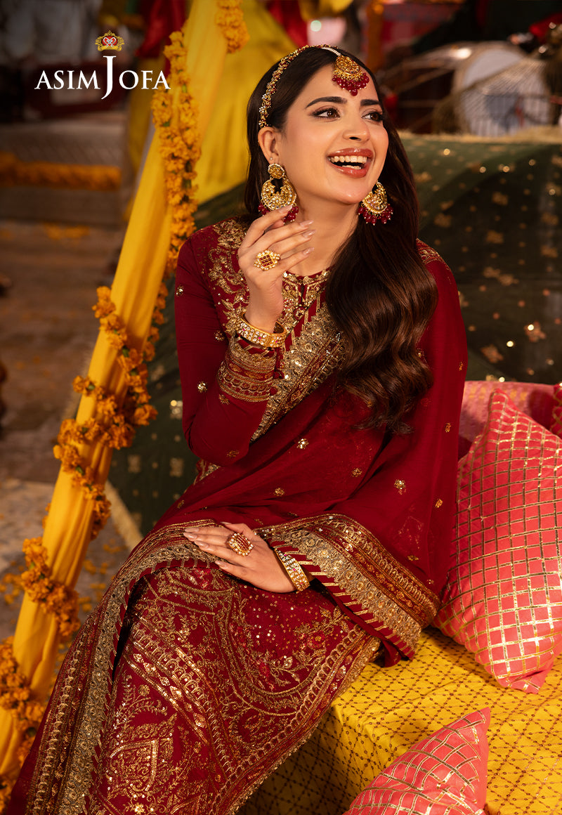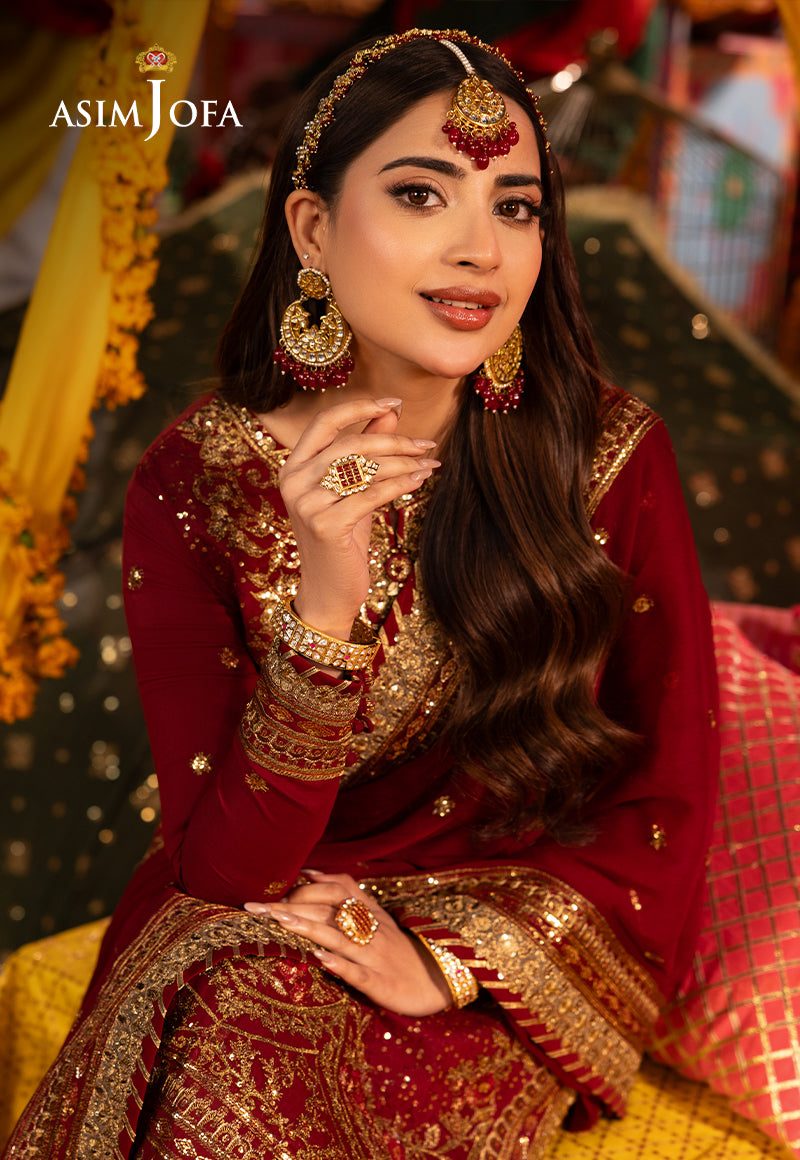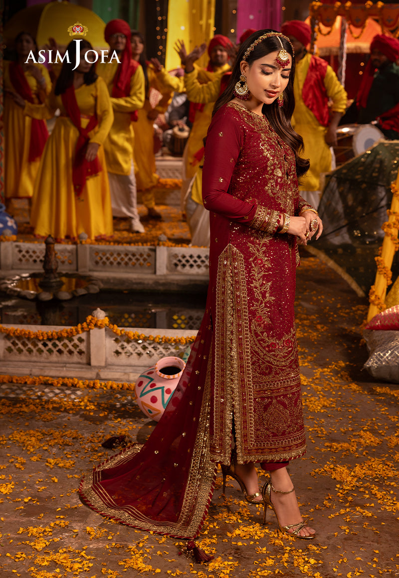Immerse yourself in the timeless tradition with this exquisite Maroon ensemble, adorned with antique gold zariwork and delicate cupped sequins, a hallmark from Asim Jofa's "Chamak Damak" Festive Collection. Enhanced with intricate pink threadwork, this ensemble exudes a sense of sophistication and charm. The traditional motifs adorning the shirt pay homage to heritage and culture, adding depth to the design. With embroidered front and back borders, sleeves, neckline, and chaak, every detail speaks of artisanal craftsmanship. This ensemble is a tribute to tradition and elegance, perfect for those who wish to embrace the richness of cultural heritage with a touch of contemporary flair.