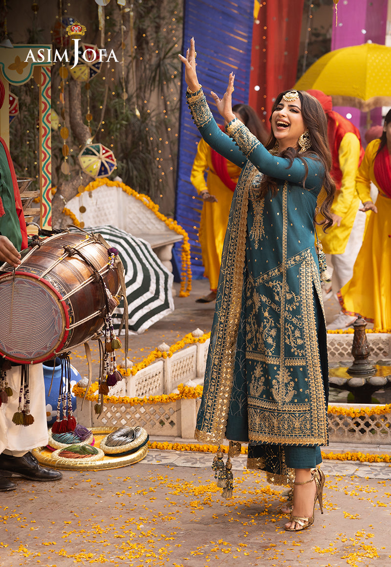 Behold the splendor of our embroidered marvel from “Chamak Damak” collection. A creation that whispers tales of elegance and grandeur. Picture yourself adorned in peacock blue, a hue that mirrors the depths of the ocean adorned with threads of gold that shimmer like treasures beneath the waves. The shirt is a canvas of intricate acanthus motifs that invites you to unravel its mysteries while the embroidered dupatta dances with the same enchanting patterns. Like a majestic peacock spreading its wings, this ensemble embodies grace and majesty inviting you to immerse yourself in its beauty and allure.