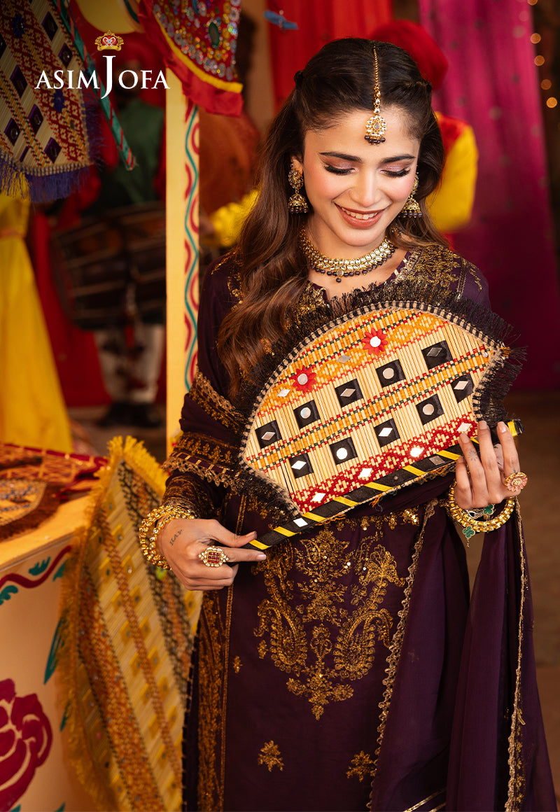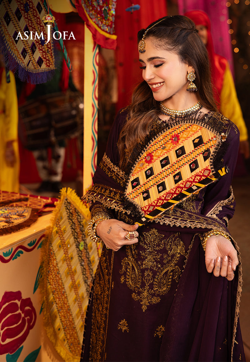 Embrace the panache of plum with our Deep Purple embroidered ensemble from “Chamak Damak†collection, a radiant creation adorned with the opulent beauty of antique gold zariwork and the subtle sparkle of cupped sequins. The contemporary mix motifs intricately embroidered across the shirt evoke a sense of modern sophistication and charm. The ensemble boasts a grand neckline and borders enhancing its allure and elegance. Paired with an embroidered dupatta, it's a symphony of color and craftsmanship designed to elevate your style and captivate the senses.
