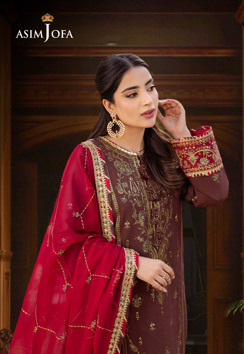 Standing amidst bustling colorful flowers Saboor Aly blooms clad in this mocha number. Artfully embroidered in two-toned mink zari & light gold cupped sequins this design combines delicate pattern with heavy borders which comes on contrast maroon color adding an oomph factor to this beautiful design. It comes with a maroon dupatta festooned in a chevron pattern complementing the shirt.