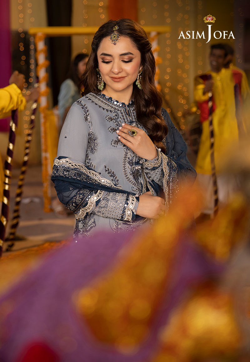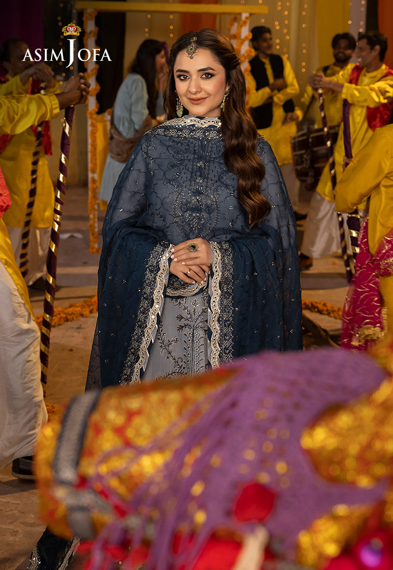 Experience Navy Elegance with this bluish-gray ensemble where the navy blue dupatta weaves a tapestry of love. The elegant design graced with gorgeous motifs, navy blue threadwork, and light gold zari is a testament to the richness of romantic emotions. Cupped sequins add a touch of magic turning each hue into a chapter in the love story told by this ensemble.