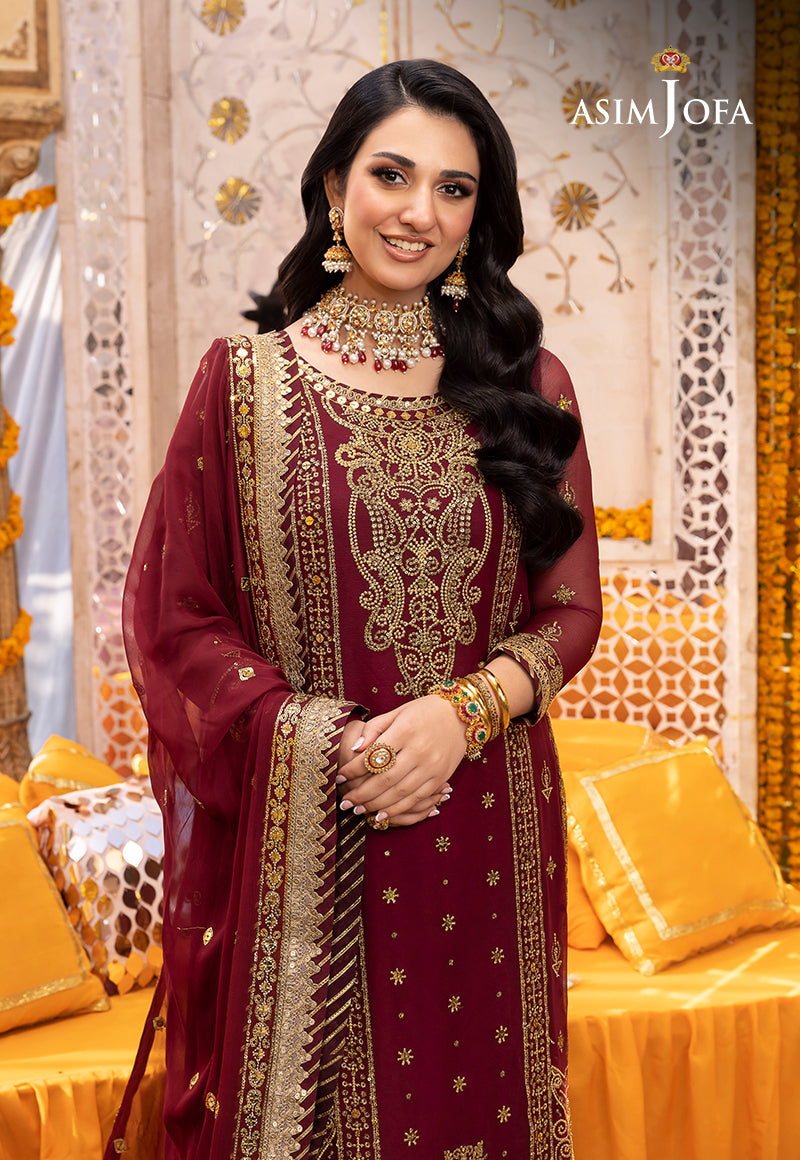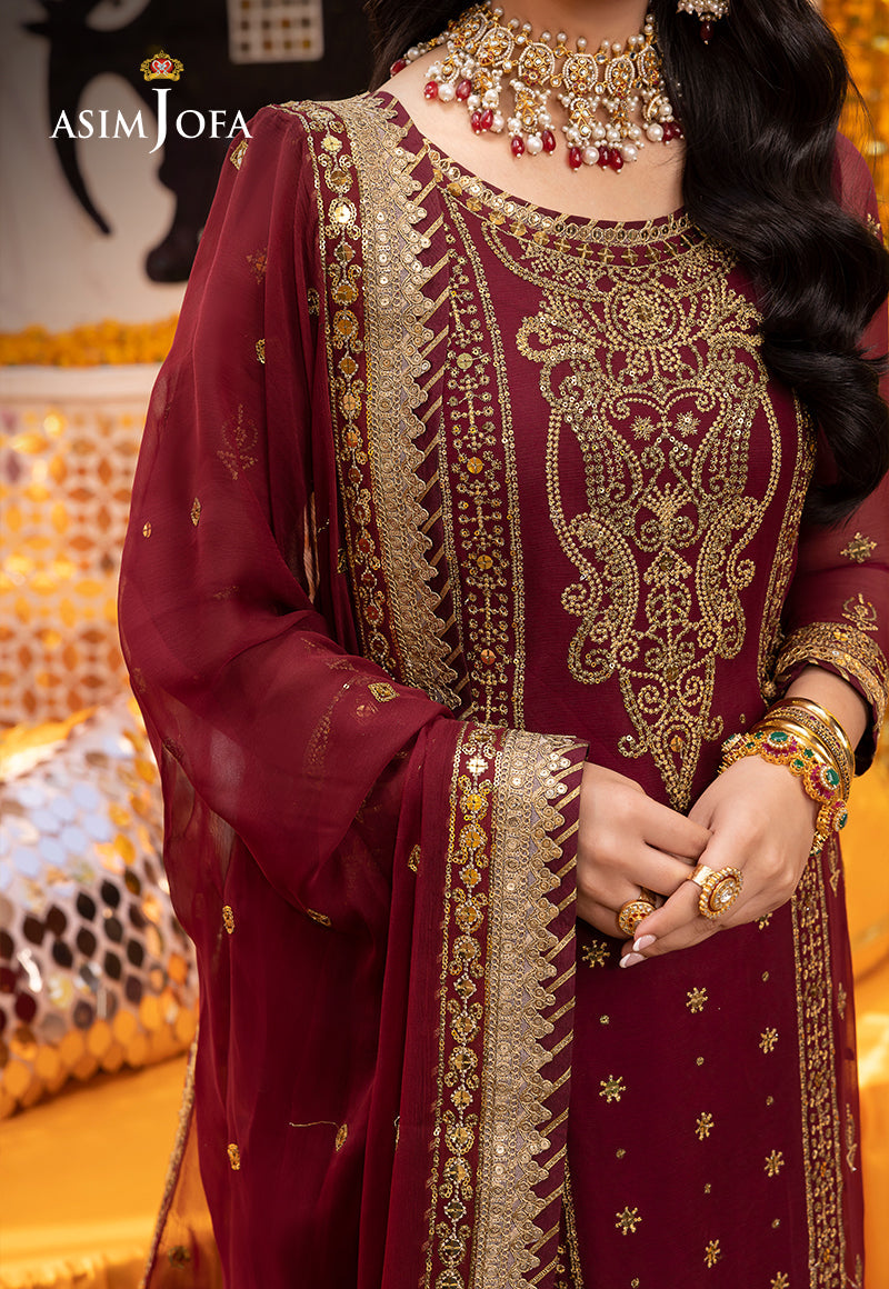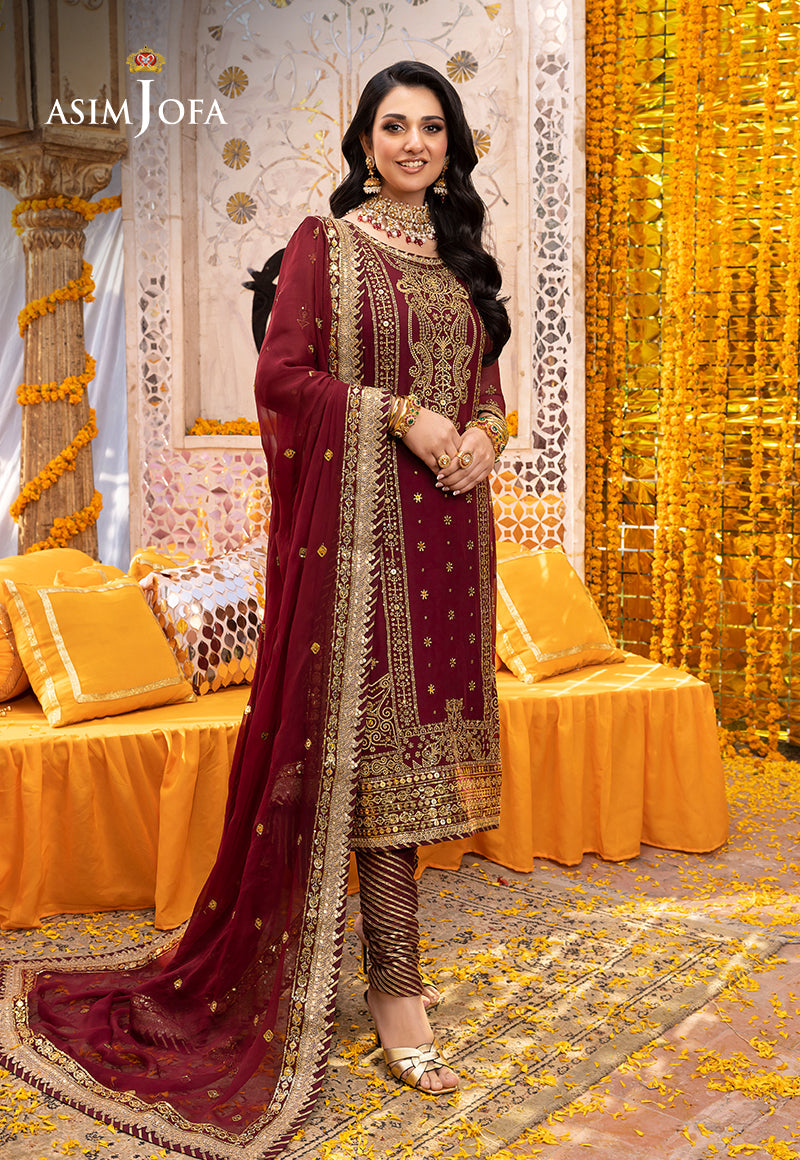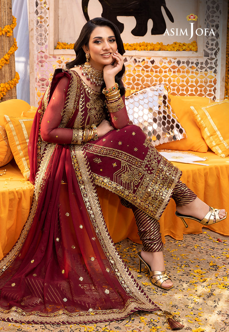 Step into the luminous world of Maroon Elegance with this enchanting ensemble. The deep maroon canvas is adorned with gorgeous heavy embroidery featuring 3mm and 9mm sequins and spangles creating a harmonious symphony. Gold zariwork adds a touch of opulence weaving tales of celebration on the center and side panels. The ensemble resonating with the joy of every desi wedding is a golden ode from the heart of the "Bajre Da Sitta" Collection.