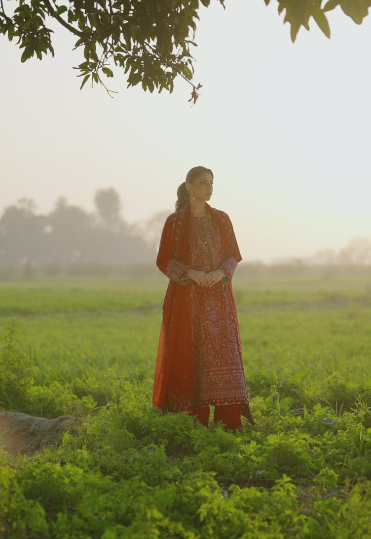 As radiant as the petals of a wild ruby-red bloom, this ensemble captures the richness of nature in its purest form. The immaculate shirt is intricately embroidered with threadwork in teal, pink, beige, and green hues, weaving a stunning fusion of floral and ethnic patterns, reminiscent of a flourishing garden in full splendor. Paired with an exquisitely embroidered dupatta, this ensemble is a poetic tribute to nature’s vibrant elegance, where every thread tells a story of beauty and grace.