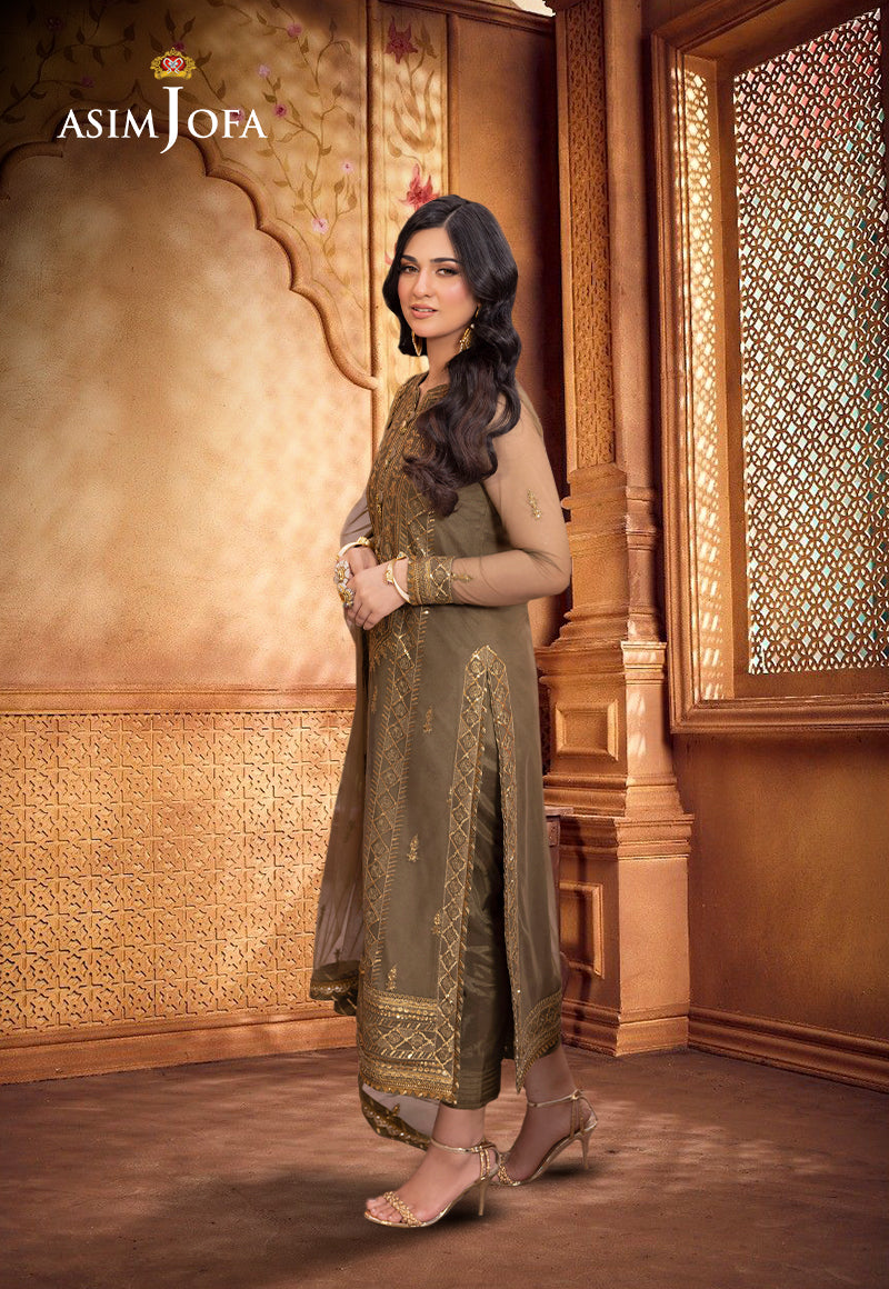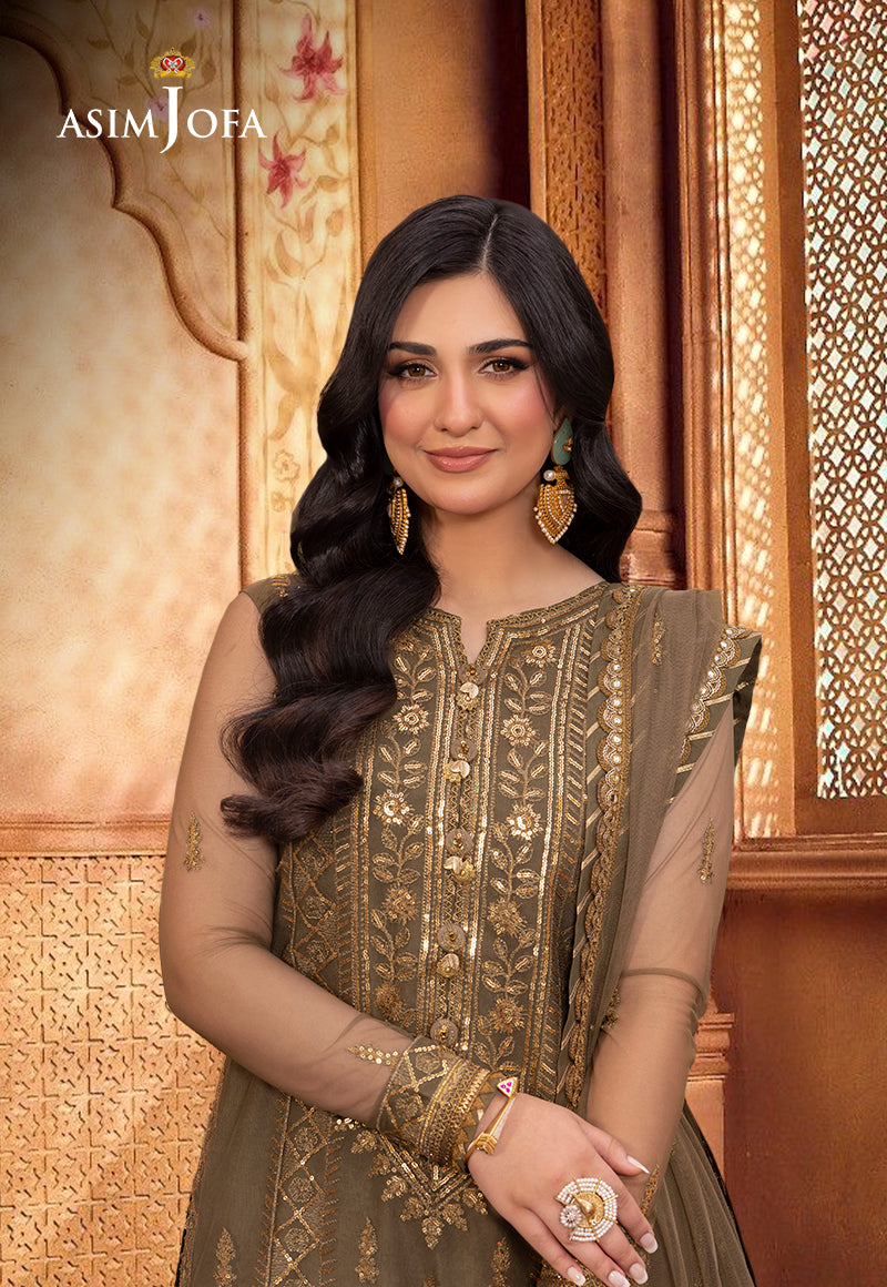 This ensemble captures the essence of cultural merriment with colors as rich and verdant as the henna that adorns hands during festivities. The shirt features exquisite gold sequins shimmering like celebratory sparklers against the lush mehndi green fabric, while the intricate gold zari work adds a touch of undeniable opulence, like calligraphy that graces a cherished manuscript. The embroidery, adorning the entire shirt, unfolds like a joyous narrative, each stitch a celebration of tradition. Paired with an embroidered dupatta personifying the essence like the perfect final verse in this ode to cultural happiness