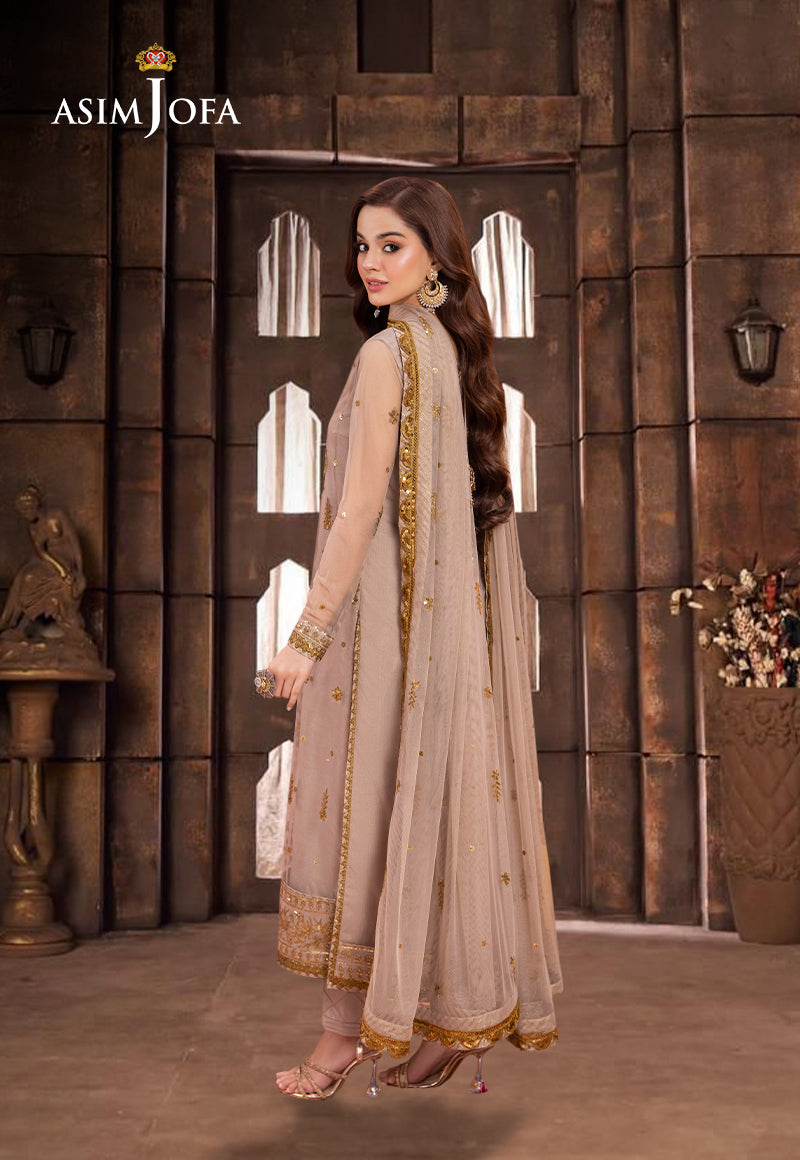 This ensemble evokes the subtle joy of a melody played on traditional instruments. The shirt in nude beige color is like the calming base note, featuring gorgeously embroidered neckline and border with the 5mm gold sequin work glimmering like festive symbols, adding bursts of brightness. Intricately graced with gold zari work that beautifully intertwines with the nude beige threadwork, the ensemble resembles an alluring display of art. The embroidered dupatta, with its embellished beauty, showcases glistening glamor while completing the composition of this joyous melody