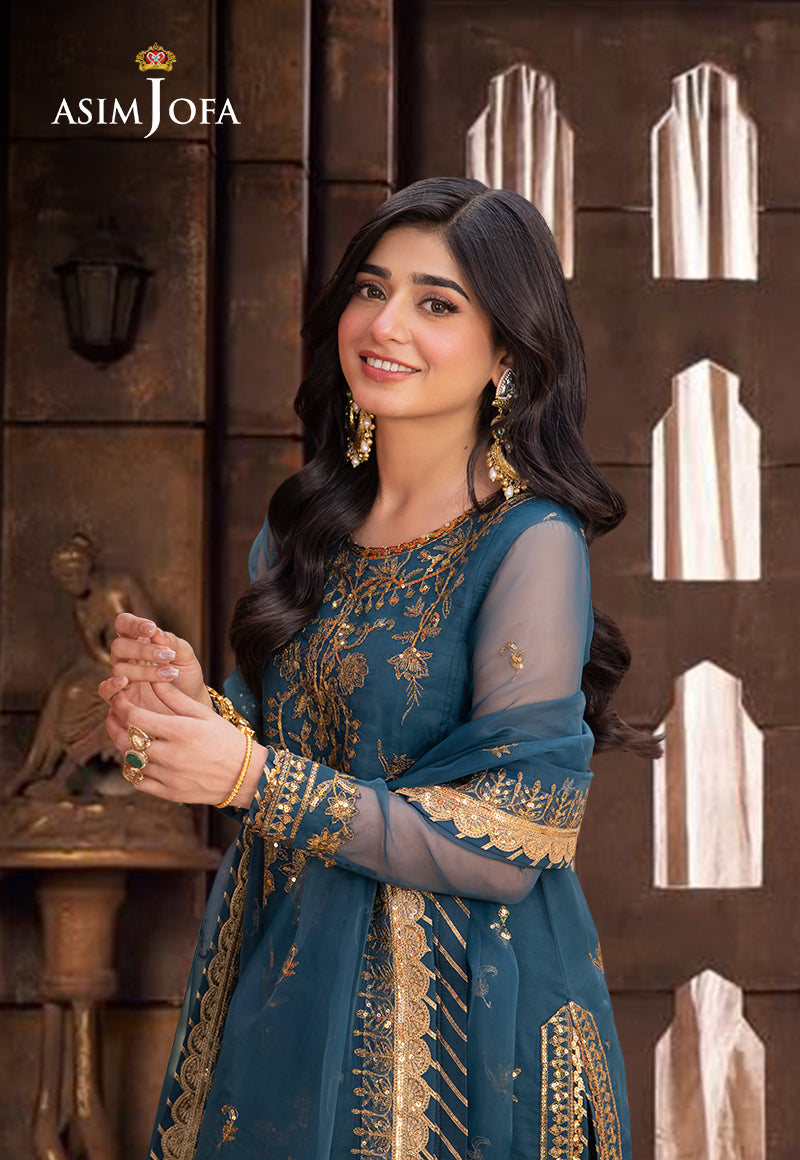 Awaken the vibrant spirit of the deep sea with this mesmerizing teal ensemble. The shirt is adorned with an intricate tapestry of embroidery, featuring a stunning neckline and borders, displaying dazzling craftsmanship, with gold sequins and antique zari work interweaved throughout, shimmering like tropical jewels scattered across a sun-dappled ocean floor. This mesmerizing effect continues onto the embroidered dupatta that resembles a treasure chest overflowing with glistening gold. This outfit is a breathtaking addition to your wardrobe, a captivating symphony of textures that whispers tales of the ocean's magic