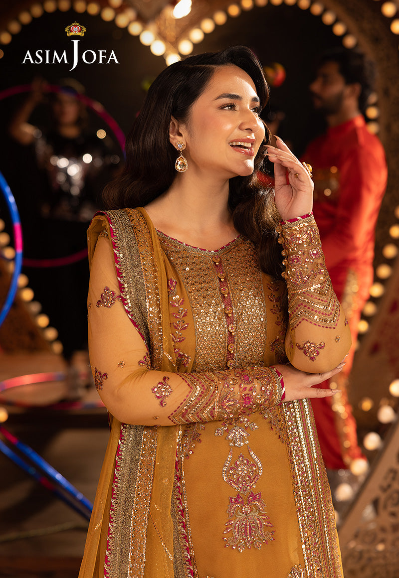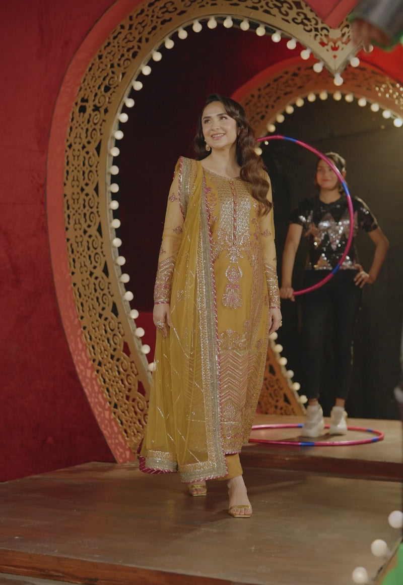Subtle yet undeniably festive, this ensemble is a quiet celebration of traditional charm. The shirt is a vision of visual eloquence, brought to life with intricate embroidery in antique gold zari and shimmering cupped 5mm light gold sequins. Delicate magenta threadwork winds its way through the design, adding a whisper of color and depth to the golden tapestry. The look is completed with a lightly embroidered dupatta that adds an airy, graceful touch—balancing the richness of the shirt with effortless poise. A refined choice for those who embrace festivity with elegance.