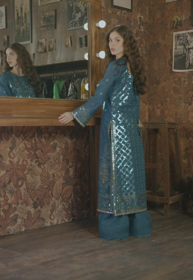 In a captivating shade of teal, this ensemble is a portrait of artistic finesse. The shirt is adorned with gorgeous embroidery featuring light gold zari that glistens with every thread, while 5mm blue sequins catch the light, adding a delicate shimmer to the design. Each detail is thoughtfully placed, creating a refined visual rhythm that feels both luxurious and contemporary. A statement of elegance and creativity, this ensemble is made for moments where style meets subtle brilliance.