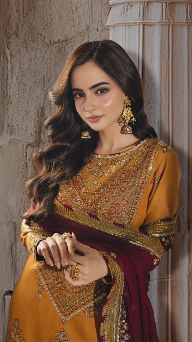 Vibrant and regal, this mustard ensemble shines with two-toned gold zari detailing, adding layers of depth and radiance. Accentuated by maroon threadwork, the design achieves a striking contrast that captures attention. Finished with shimmering 5mm gold sequins and an embroidered chiffon dupatta, this outfit celebrates bold elegance with a hint of traditional charm.