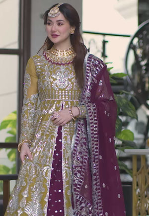 Asim Jofa's latest collection ‘MERA HASEEN JORA’ is a true representation of his exquisite craftsmanship. The majestic combination of butterscotch and plum is a bold statement, enhanced by the designer's masterful use of zari and sequins embroidery technique. The intricate golden cultural motifs that adorn the entire ensemble, including the peshwas, lehenga, and dupatta, showcase the designer's attention to detail and expertise. The dupatta's border work and broad borders on the peshwas daman and lehenga border are an example of jofa's unmatched skill. This is an ensemble that represents regal elegance and timeless beauty that will be hard to forget.