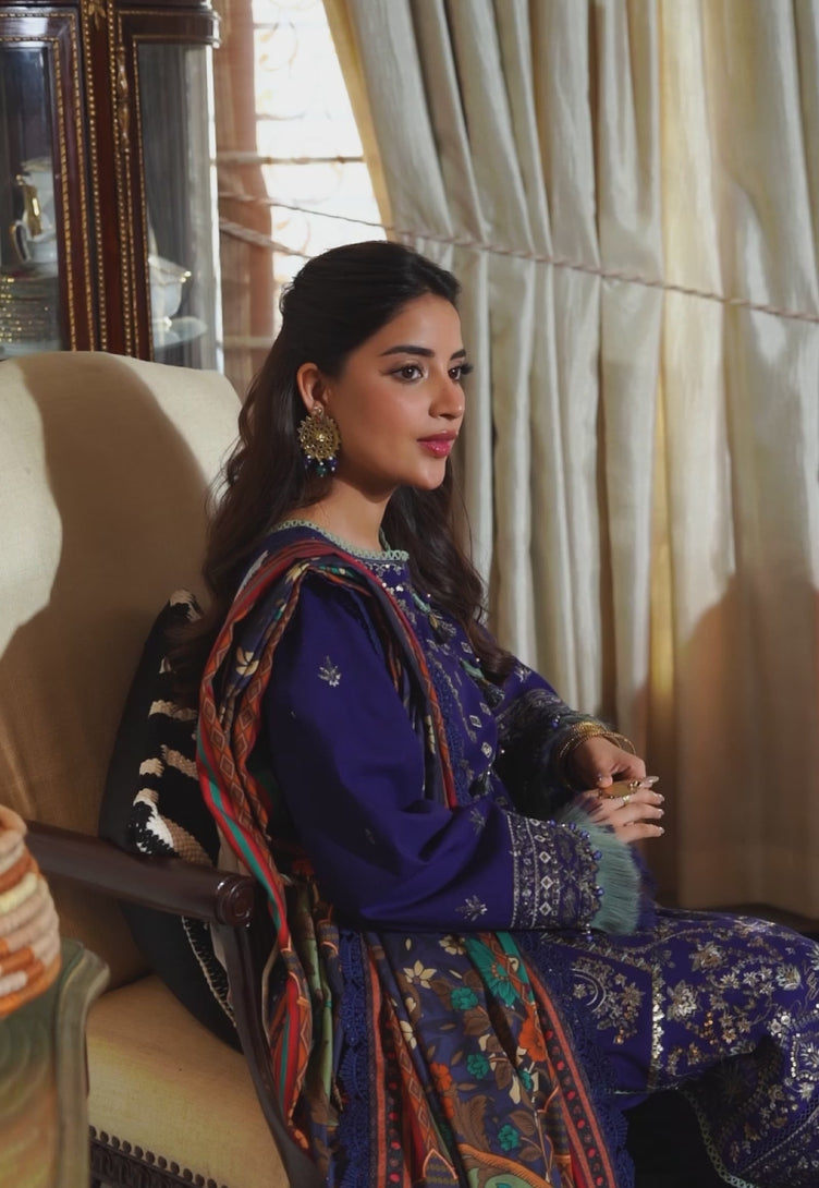 Embrace the winter's embrace with Aira - Winter Shawl Collection's ensemble as Saboor Aly. This stunning blue attire with a printed linen shawl is your key to unlocking the secrets of the frost-kissed season. The azure shirt is a canvas adorned with intricate gold zari and thread embroidery reminiscent of cultural vibes. The printed linen shawl features playful colorful pattern that add a touch of magic. Whether you're stepping into a formal event or cozying up, this outfit will envelop you in winter's enchantment