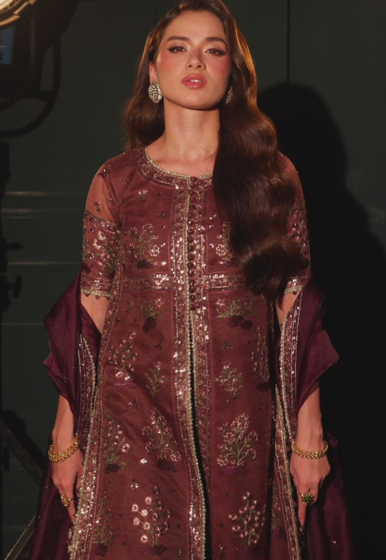 Drenched in the soft allure of maroon, this ensemble redefines elegance with its front-open jacket style shirt. The design is enriched with light gold zari and sequins, intertwined with sage green, plum, and dull pink threadwork that creates a symphony of delicate hues. The dupatta in a deep maroon shade is beautifully embroidered with grand motifs scattered across its expanse, offering a statement of artistry. Paired with elaborately embroidered trousers that add a modern edge, the look is immaculate for any celebratory occasion.