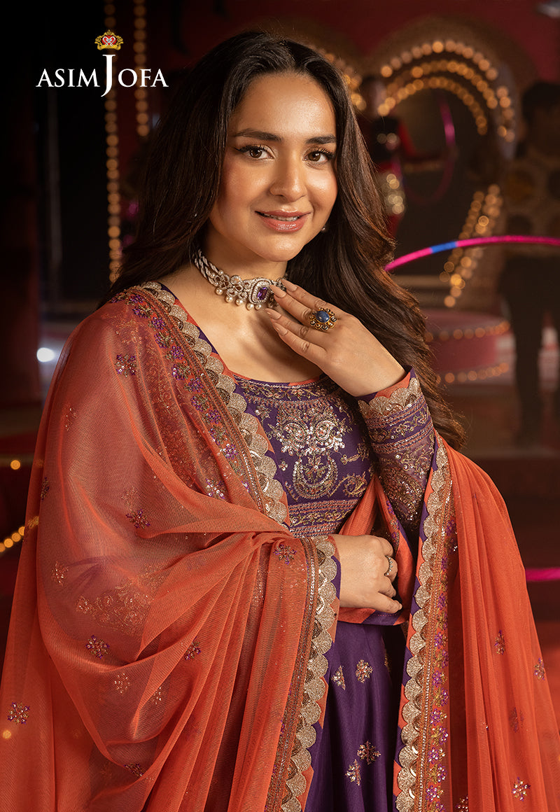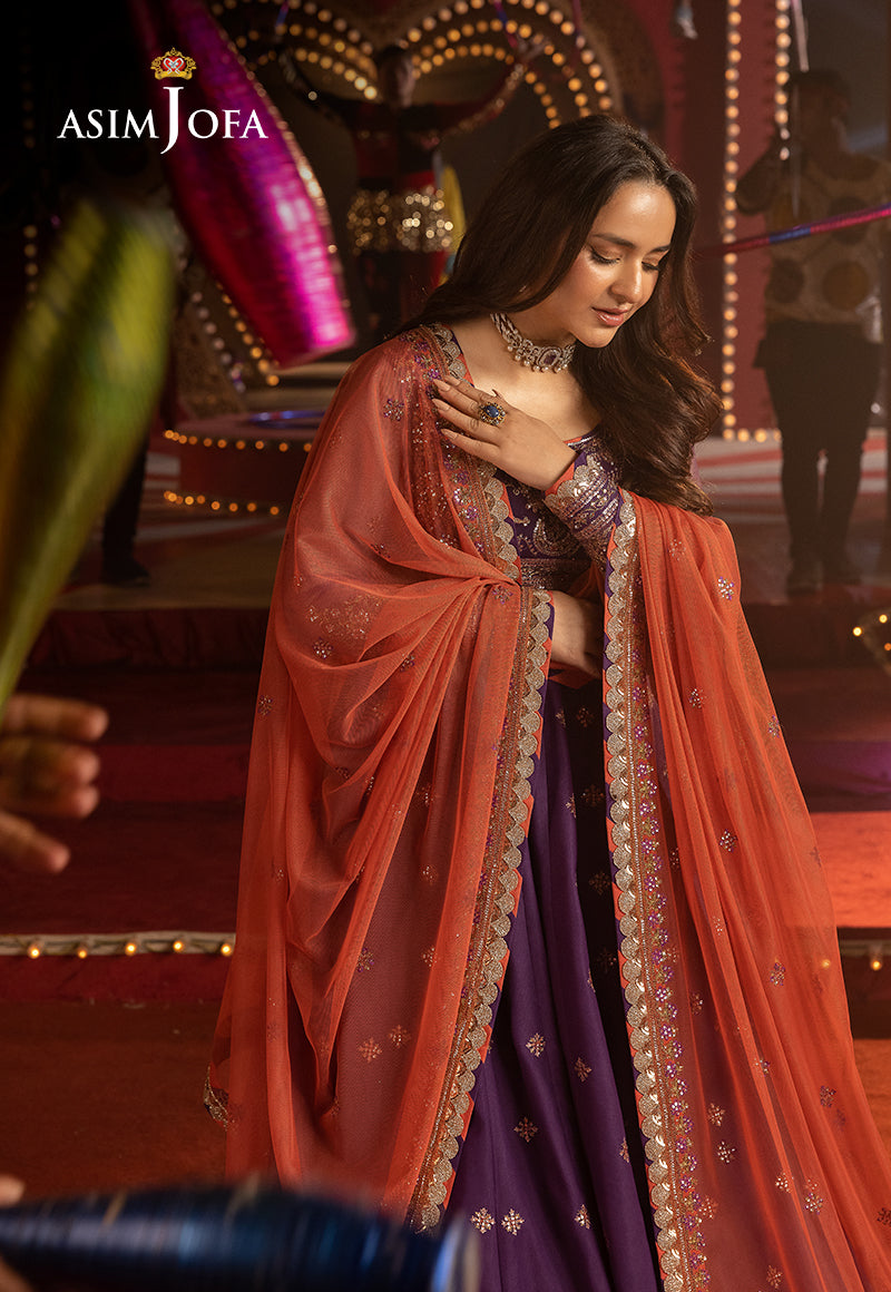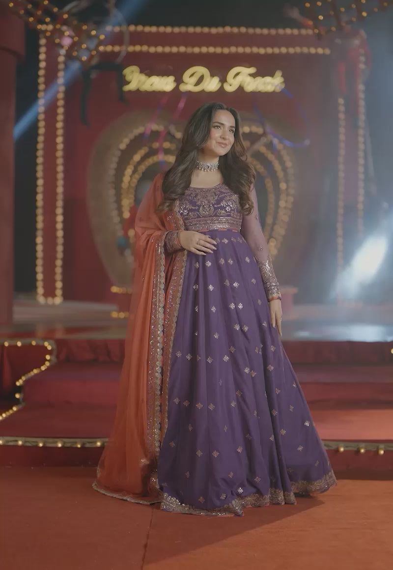 Wrapped in a regal shade of purple, this kalidaar is a poetic blend of tradition and grace. Each panel is brought to life with intricate embroidery, where light gold zari and sequins shimmer like dawn’s first light upon dew-kissed petals. Strokes of magenta and rust thread weave through the design like a painter’s brush across a canvas, adding dimension and richness to the silhouette. The ensemble finds its perfect contrast in a soft peach dupatta, lightly embroidered to whisper elegance. A timeless creation, this piece is made for moments that deserve a little magic.